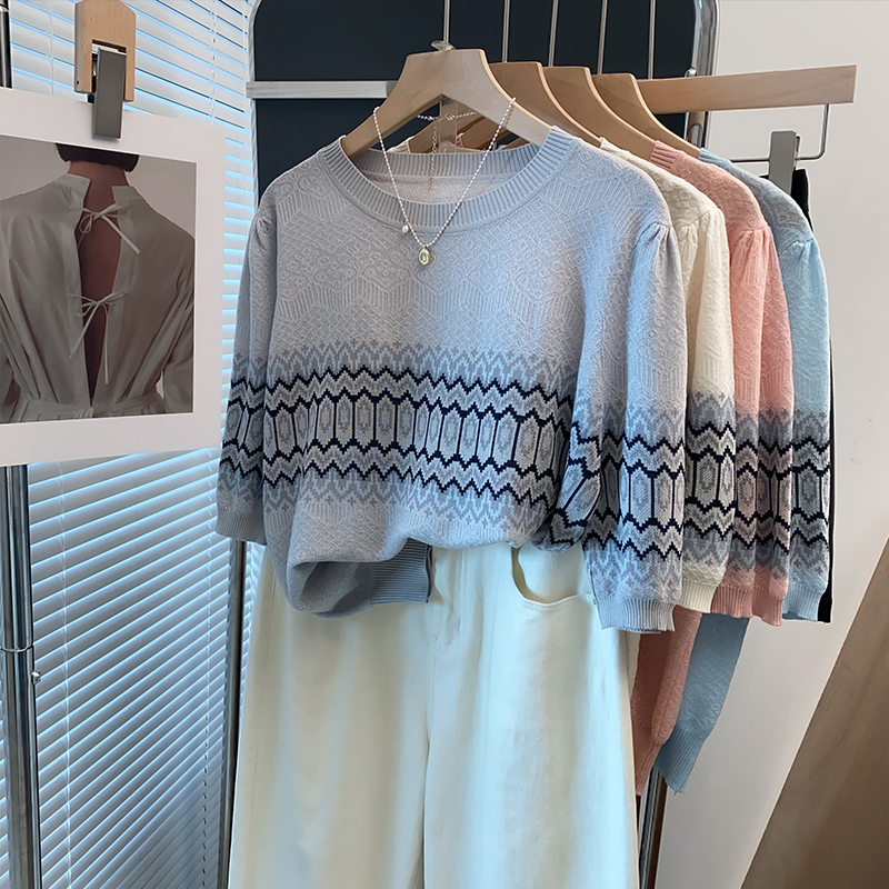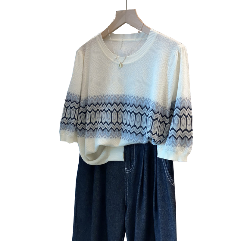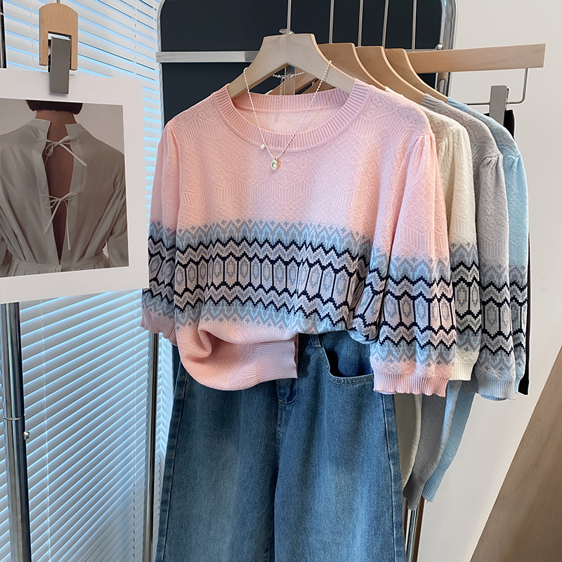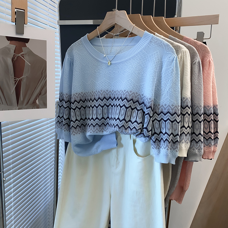蕾丝圆领针织衫女套头2025夏装新款宽松外穿上衣内搭短袖t恤衫潮