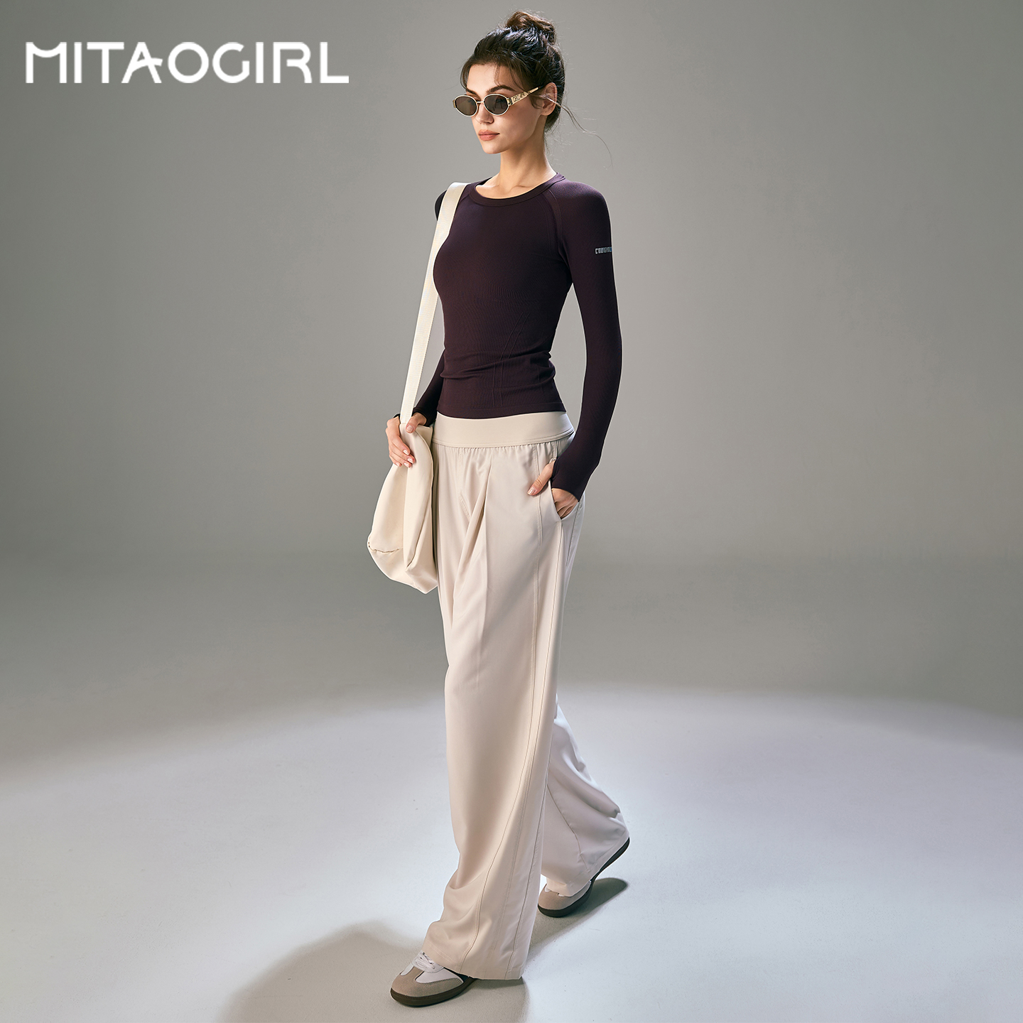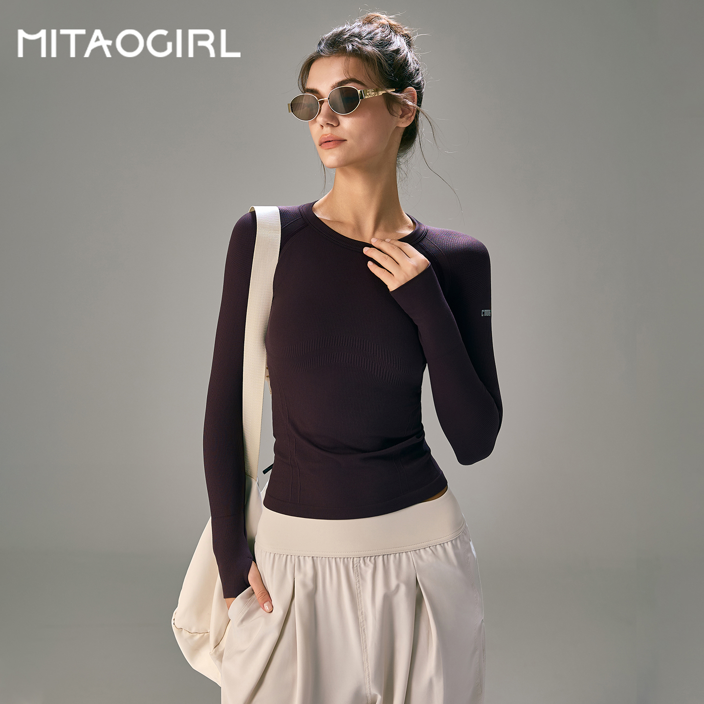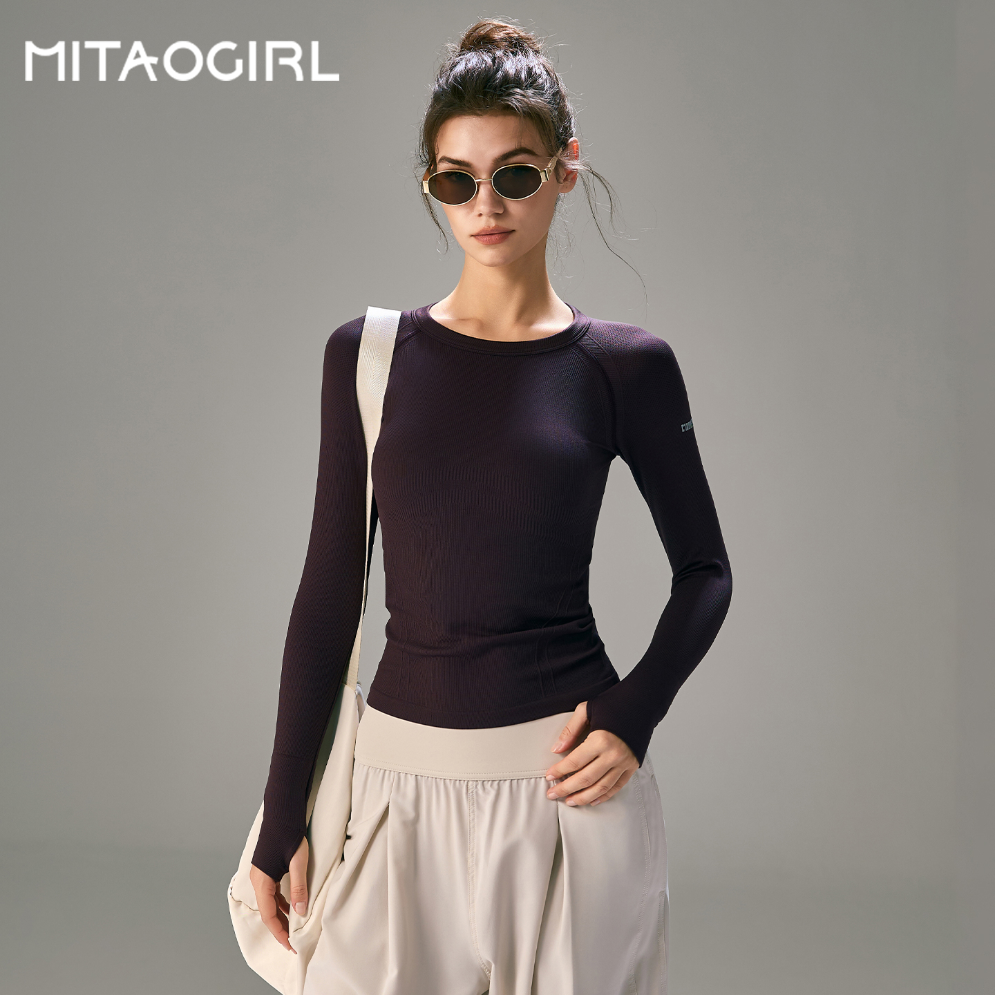 mitaogirl肯豆长袖上衣女秋季新款跑步运动T恤修身打底瑜伽健身服