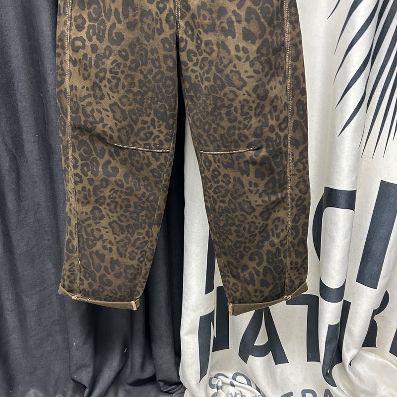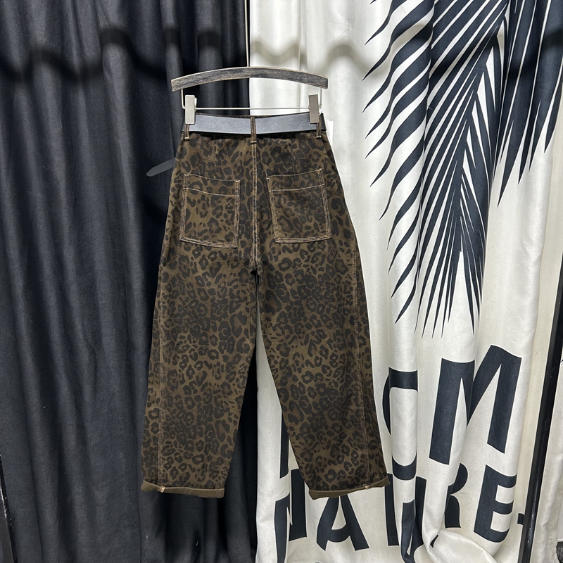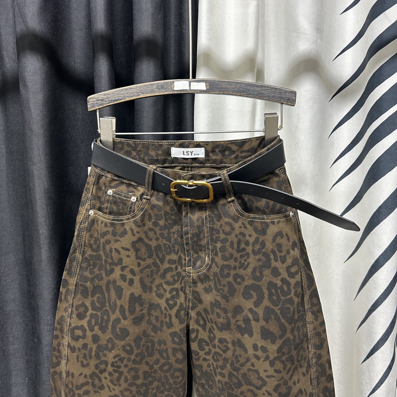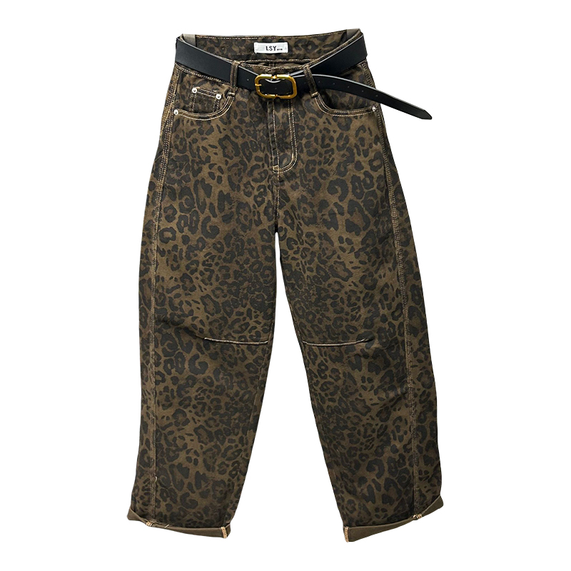 豹纹复古高腰宽松阔腿哈伦牛仔裤