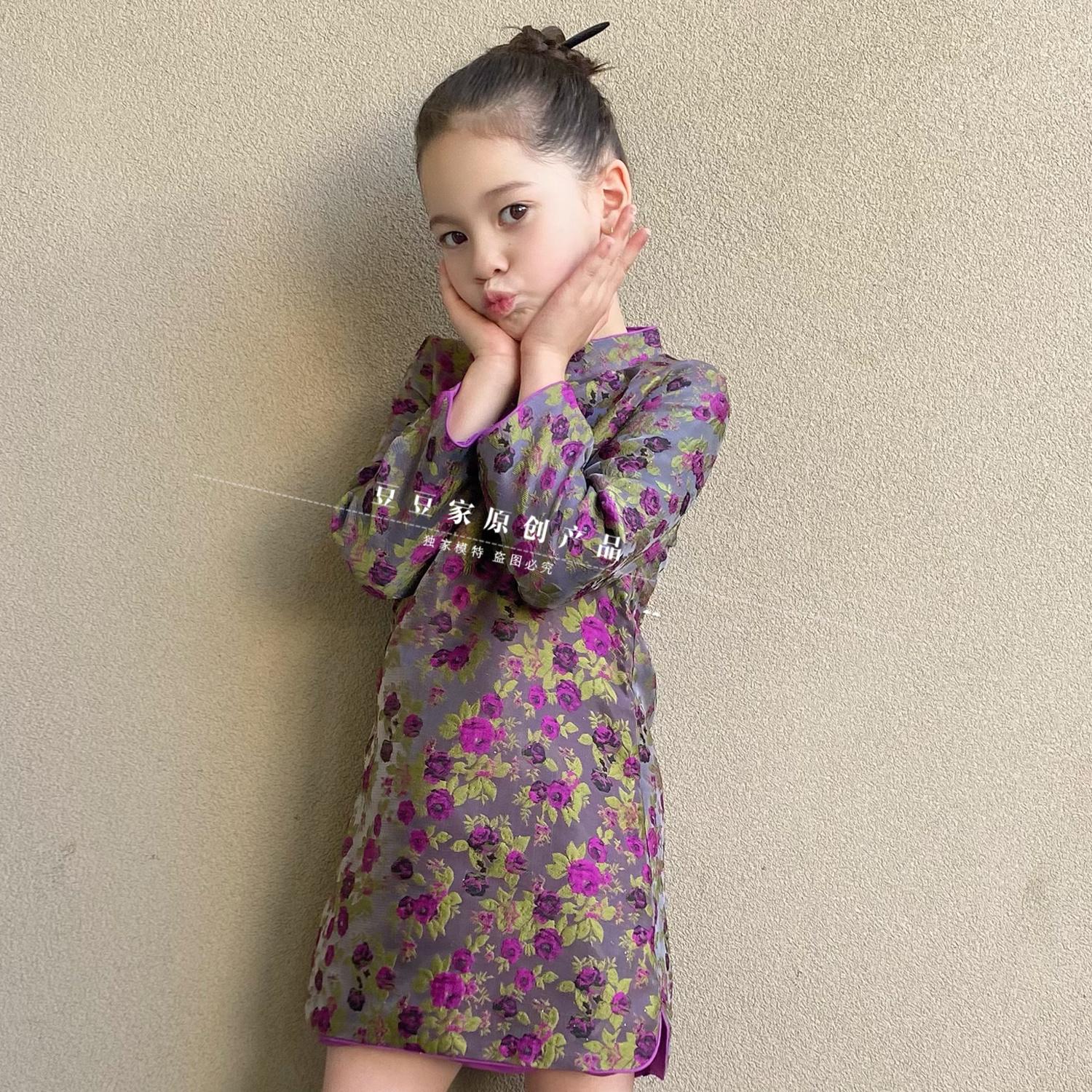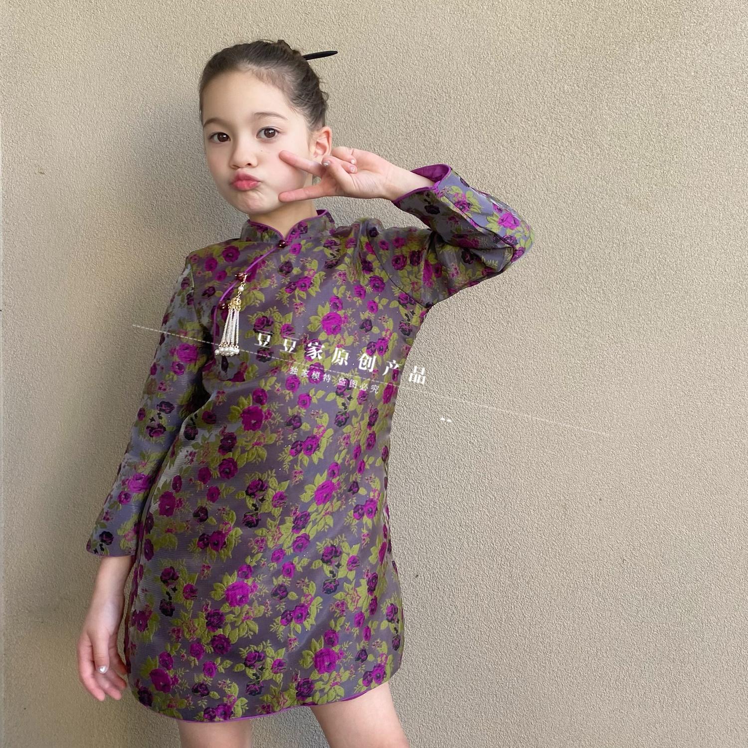 典雅立领新中式女童国风高端改良旗袍裙A字裙儿童旗袍裙新年款紫