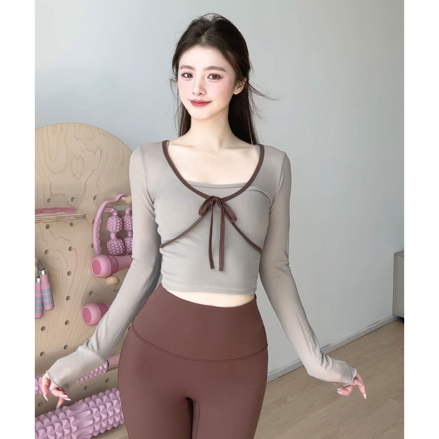 瑜伽服长袖上衣春季款带胸垫