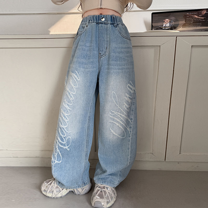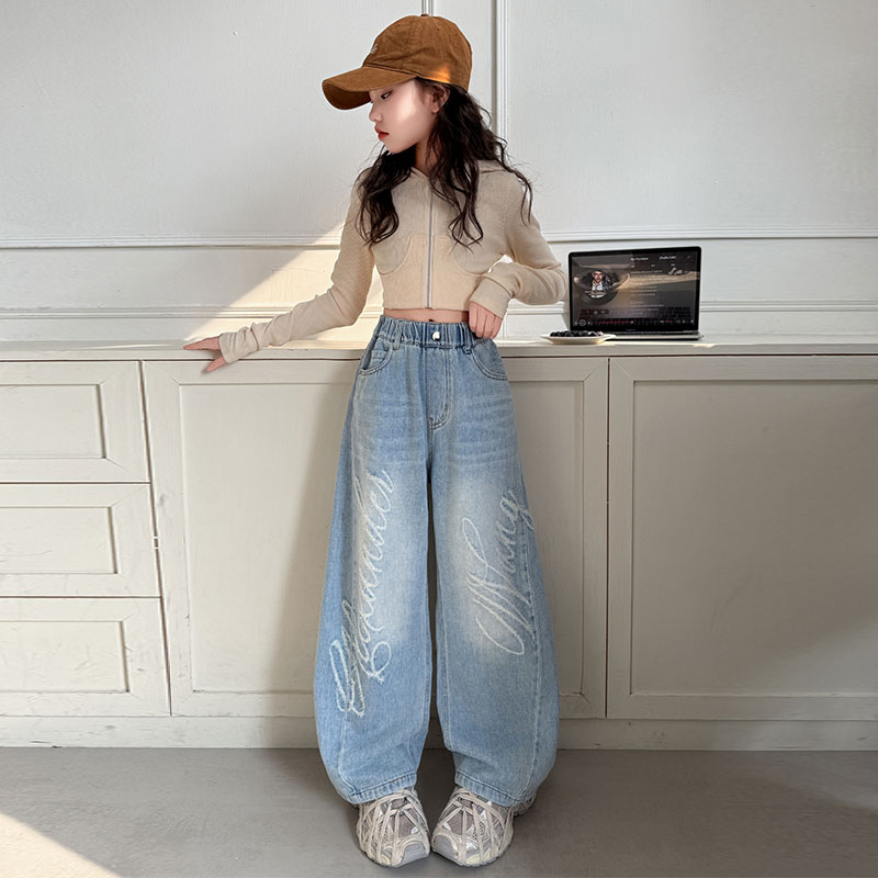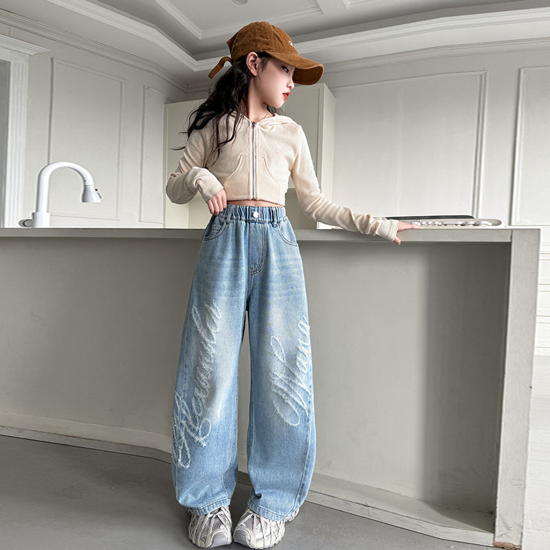 女童牛仔裤2025新款春秋儿童裤子宽松洋气阔腿裤女大童长裤潮款