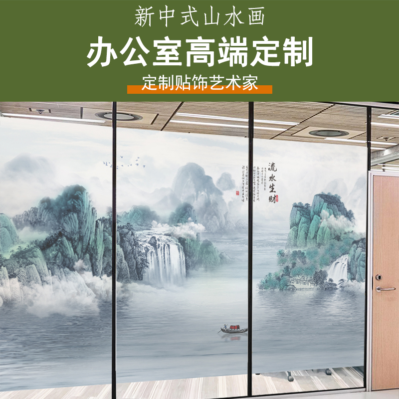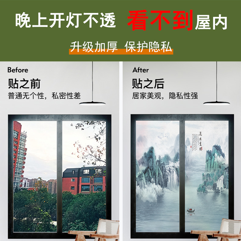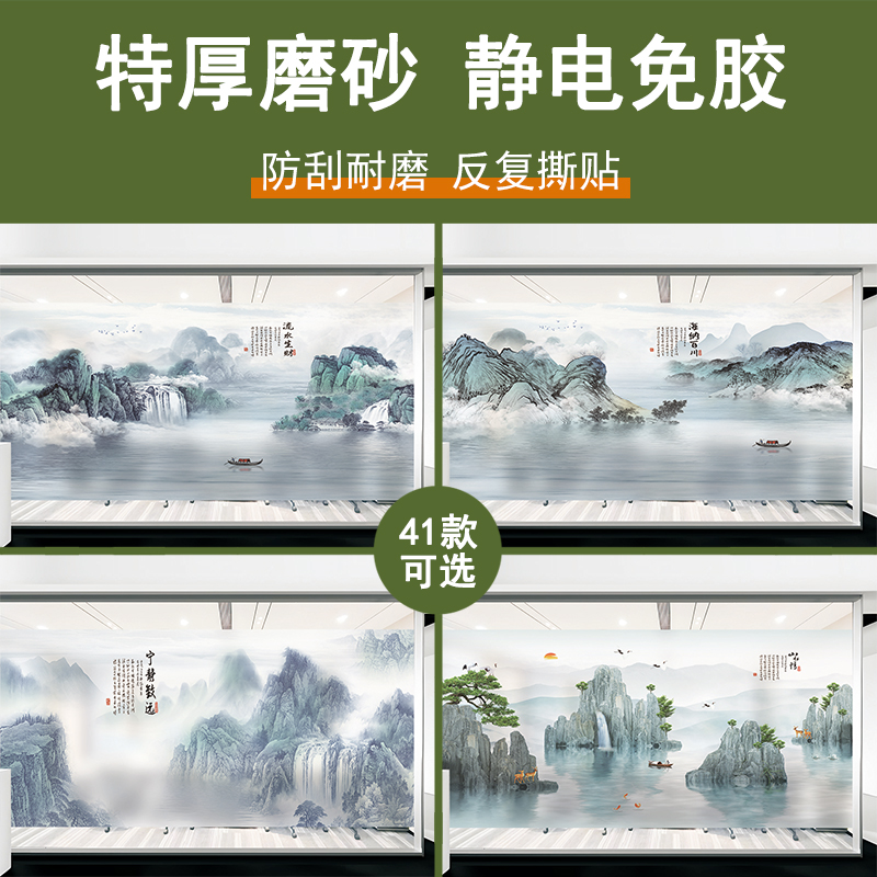 山水画办公室玻璃隔断门窗户贴纸玻璃透光不透明防窥定制磨砂贴膜