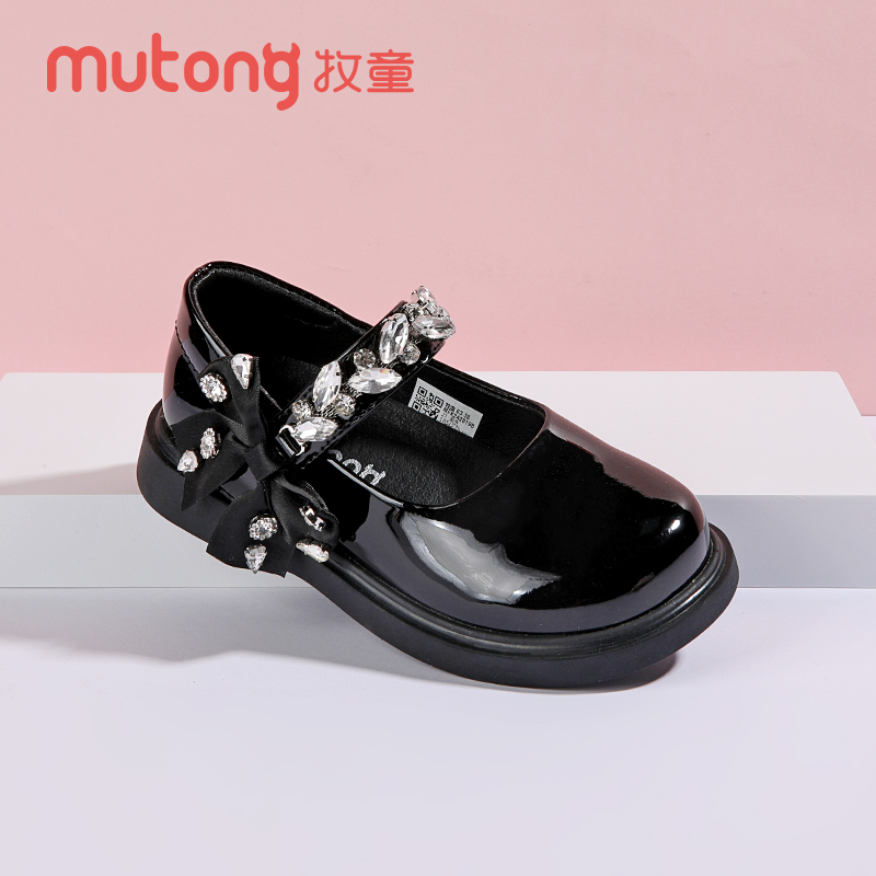 牧童童鞋春秋季新款女童亮面皮水钻蝴蝶结舒适方口防滑小皮鞋