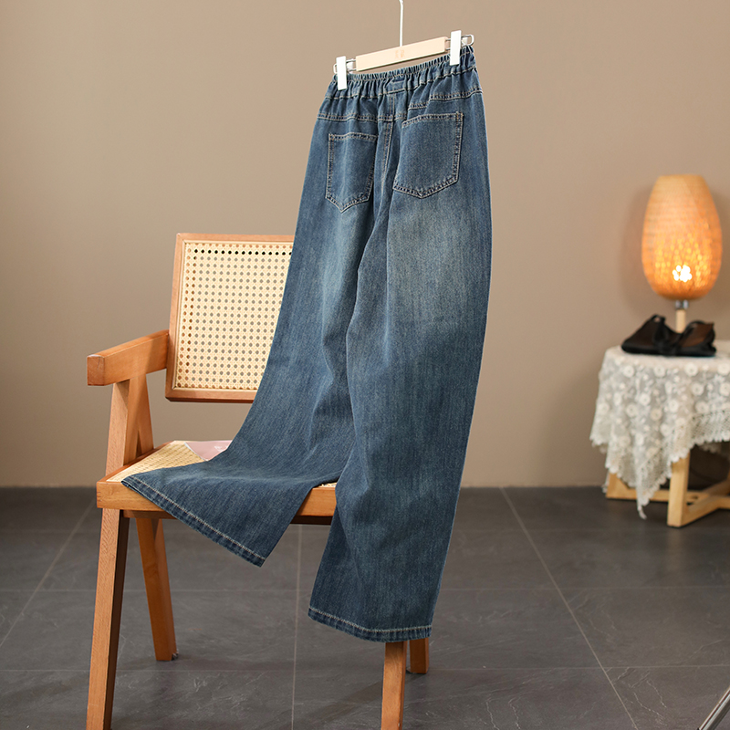 松紧腰牛仔裤女士新款大码直筒阔腿长裤显瘦简约休闲高腰复古百搭