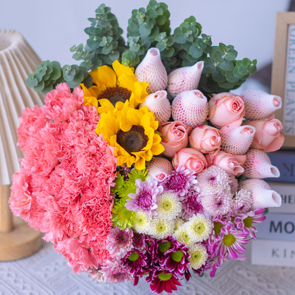 【爆款福利】粉玫瑰10只+康乃馨10枝+混色小雏菊+向日葵+配草