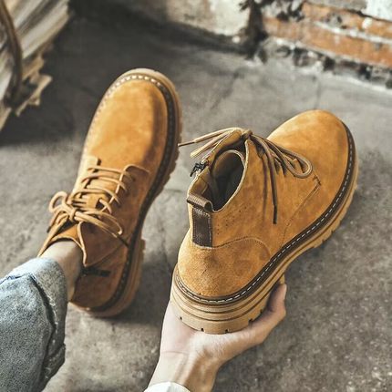 马丁靴男真皮高帮侧拉链内增高黄色工装鞋复古英伦冬季厚底大黄靴
