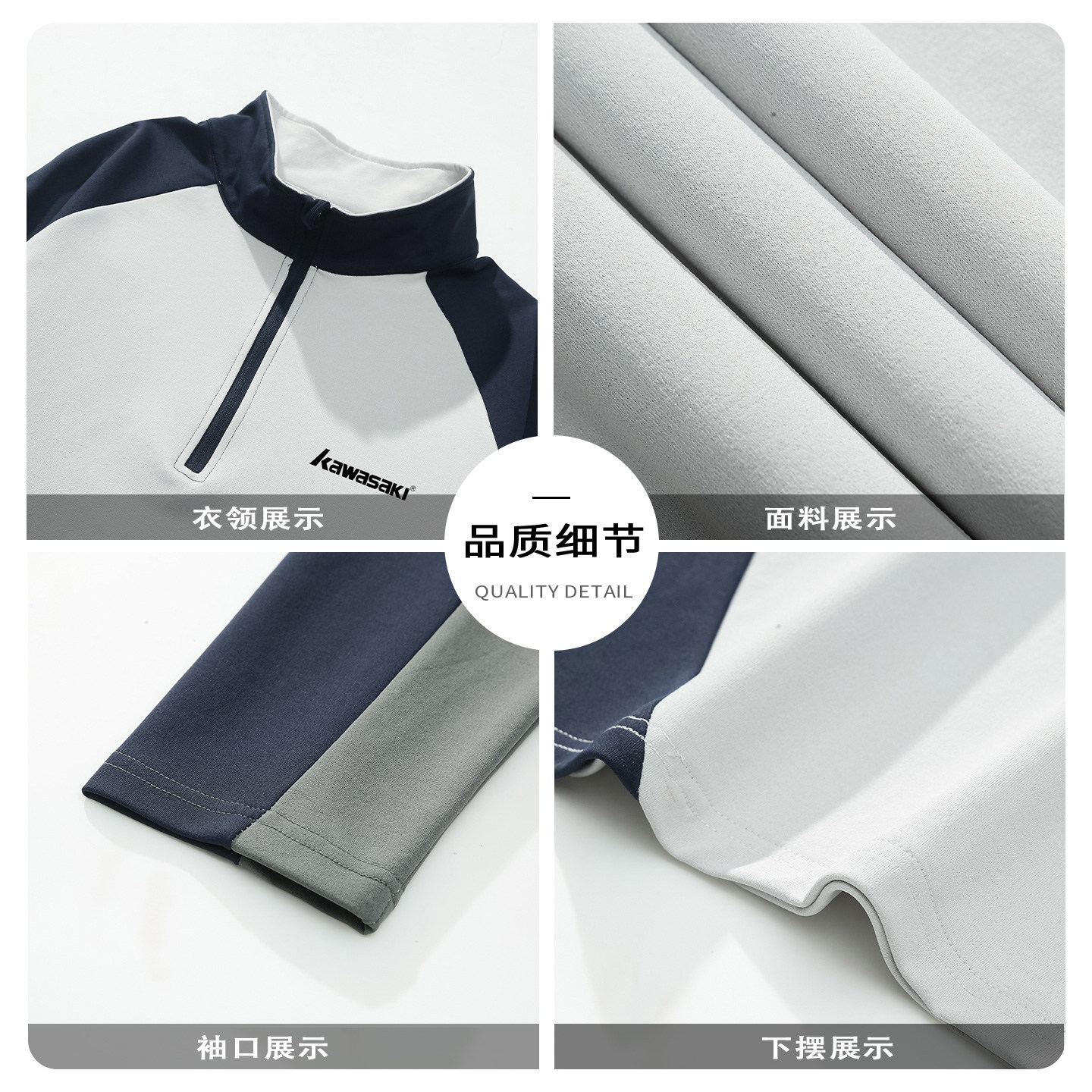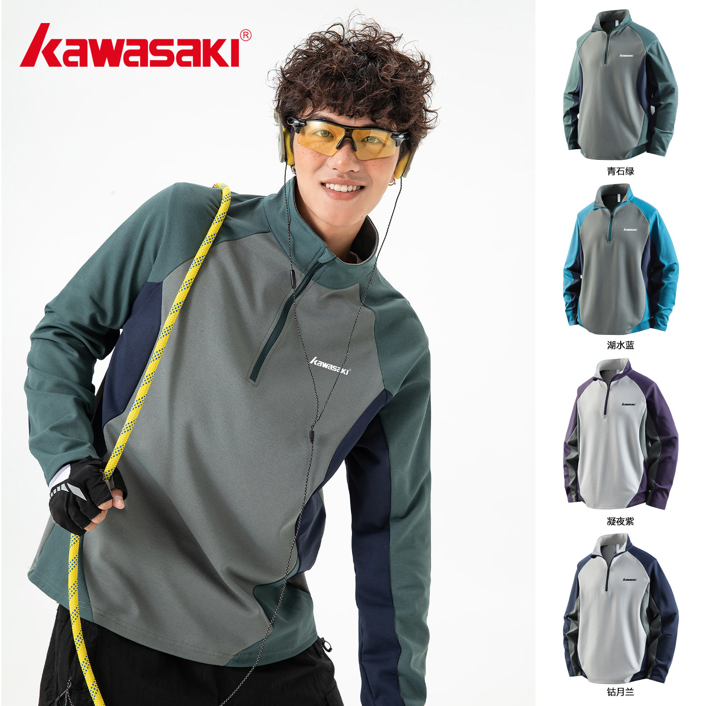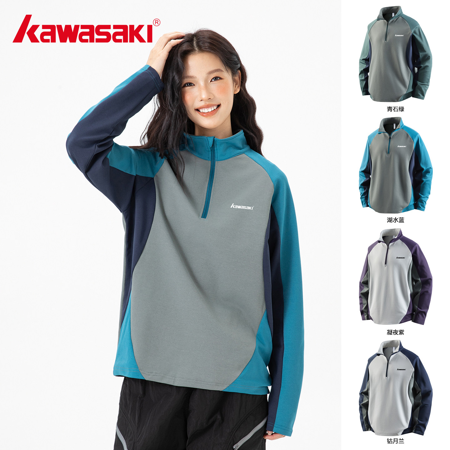 Kawasaki川崎正品运动轻户外速干打底长袖T恤男女宽松半拉链上衣