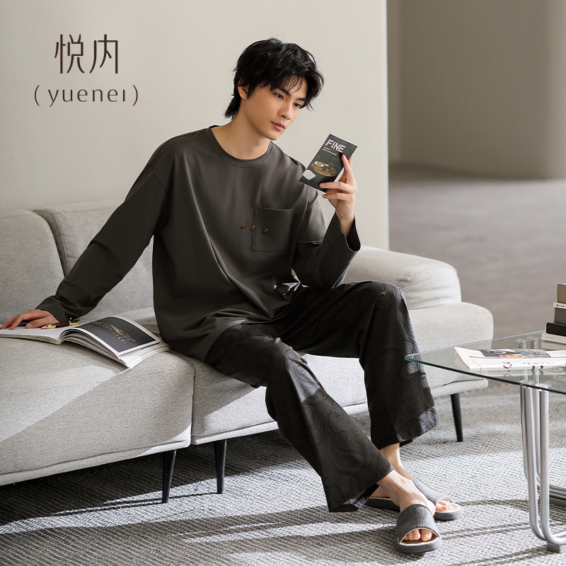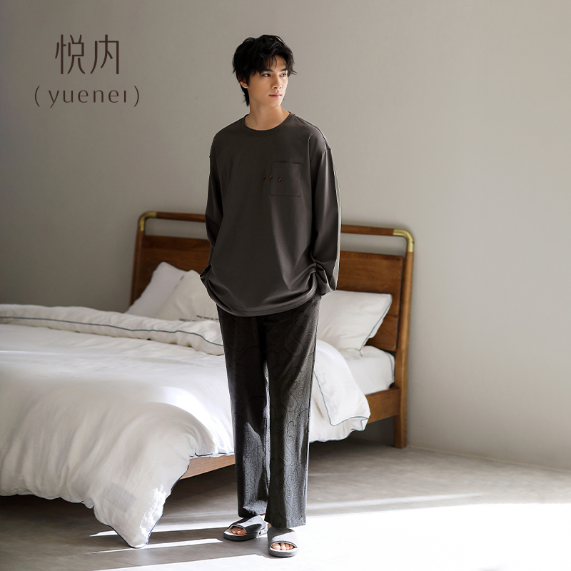 悦内睡衣男款春秋季纯棉长袖家居服男士休闲宽松大码圆领套头套装