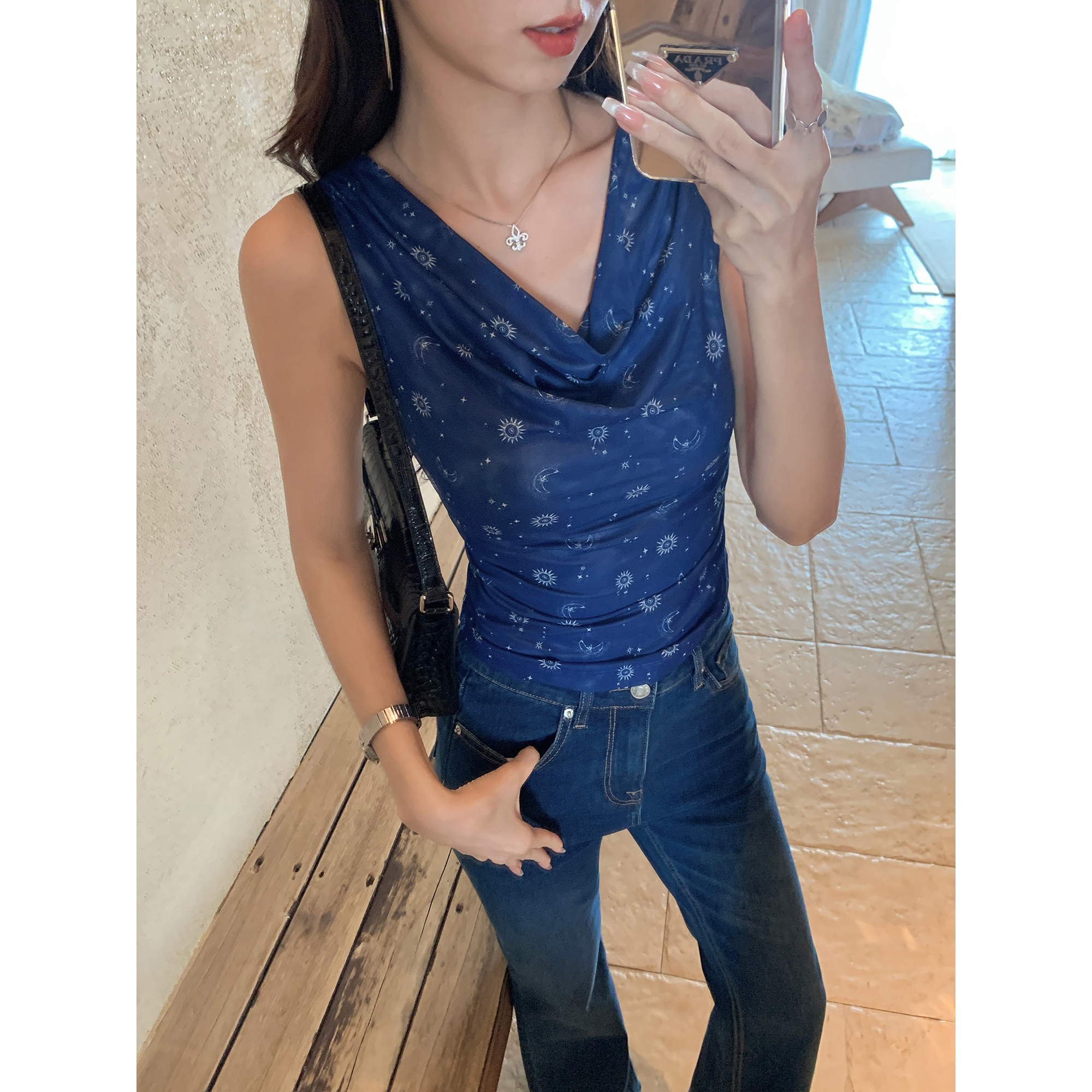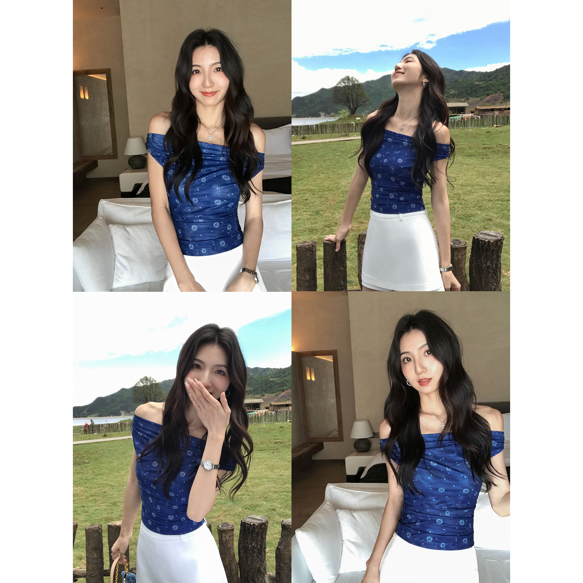 MULVAN 星河少女 双版本穿法碎花V领一字肩T恤背心女露肩荡领上衣