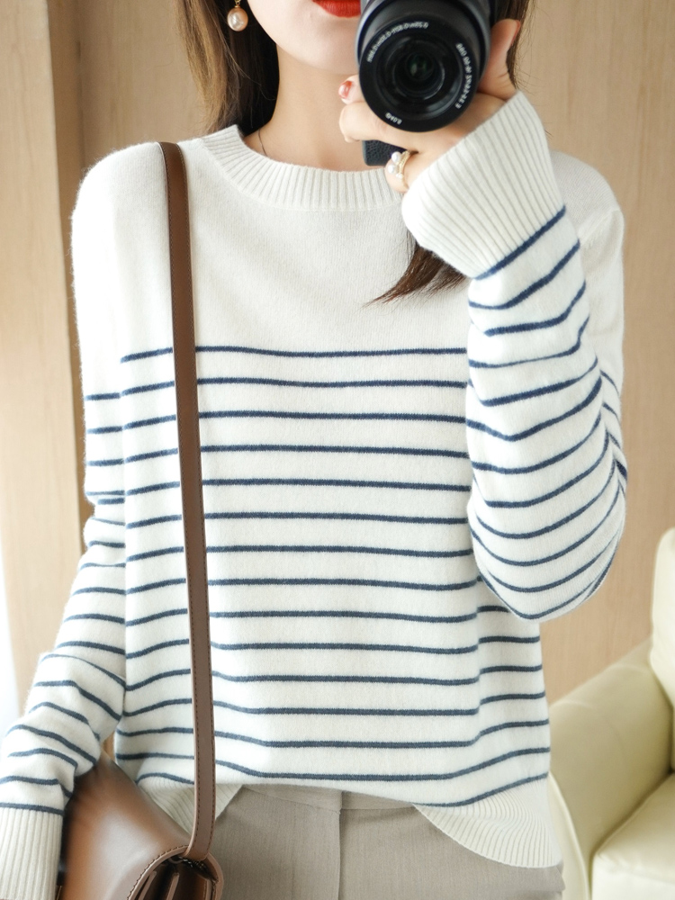 秋冬季套头毛衣女撞色条纹圆领针织衫2024新款羊绒衫打底长袖上衣