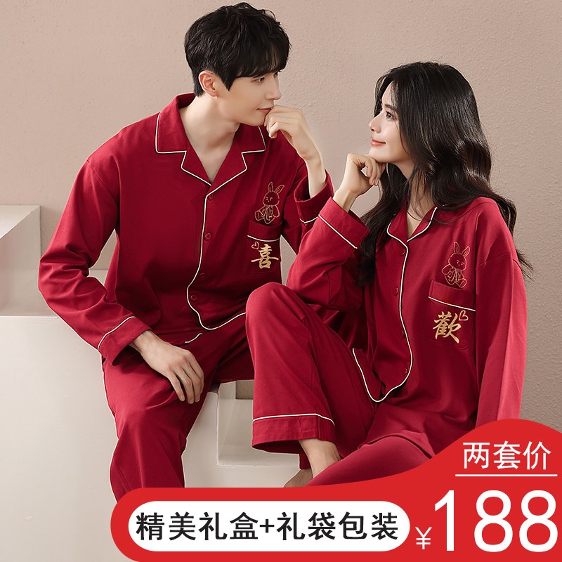 睡衣结婚新婚情侣套装女秋冬季纯棉长袖男士红色本命年冬款家居服