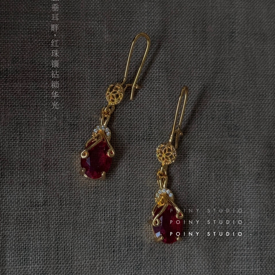 复古红色锆石耳环女小众设计感高级感气质精致水滴耳坠新年耳饰