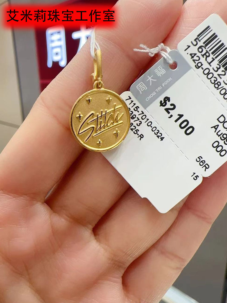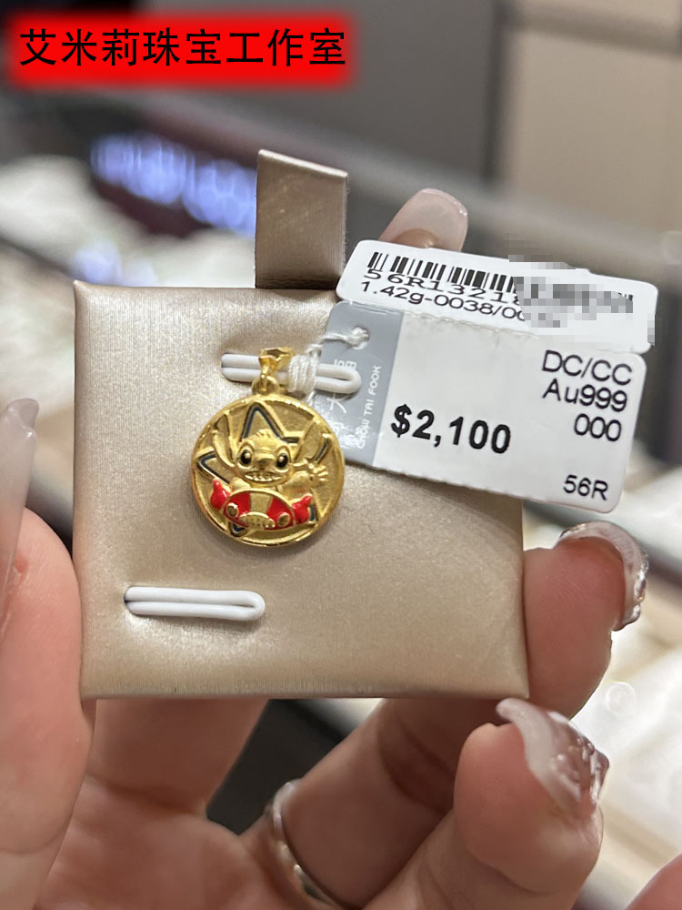 周大福迪士尼系列999足金专柜圆牌黄金珐琅彩史迪仔吊坠女款挂坠