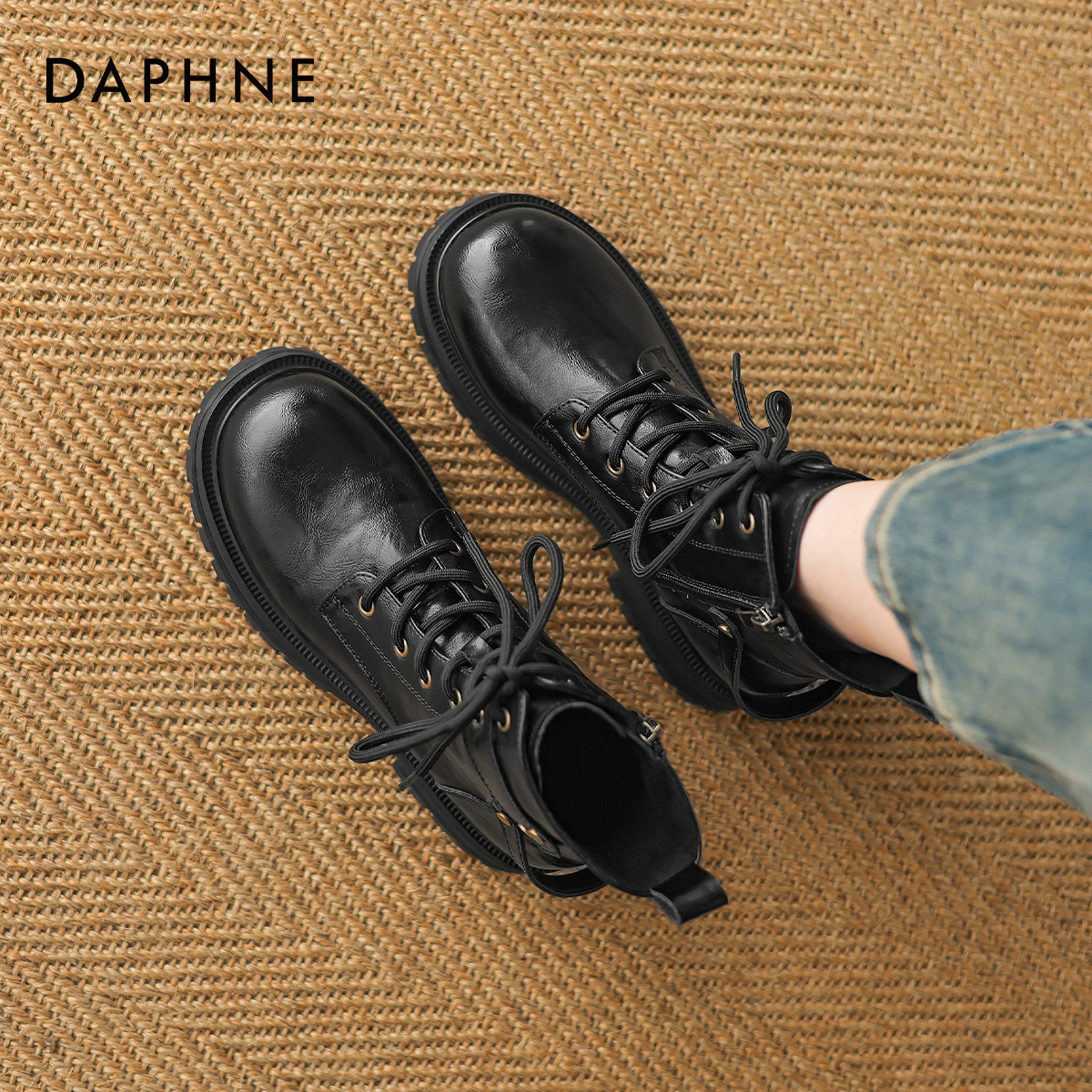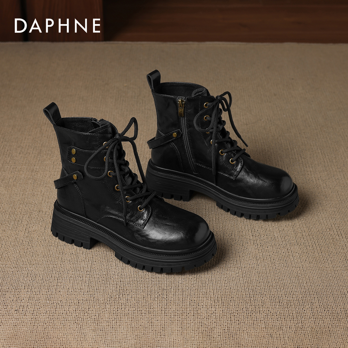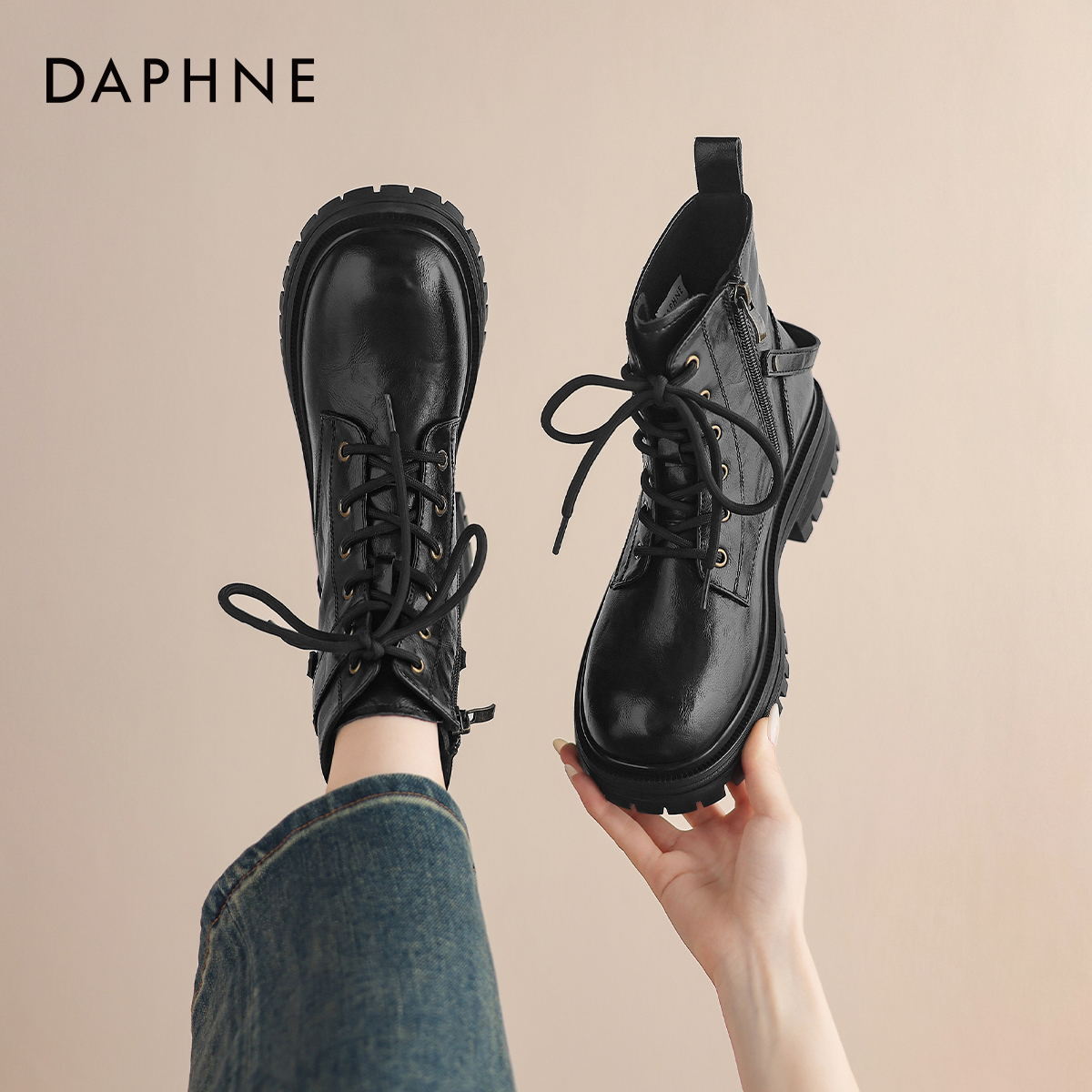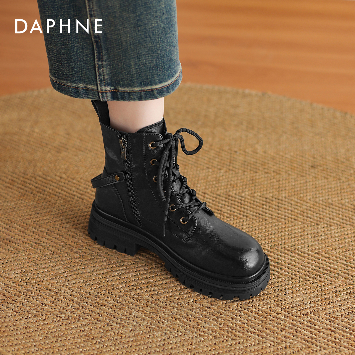 达芙妮马丁靴女款2025新款英伦风黑色靴子秋季机车骑士靴厚底短靴