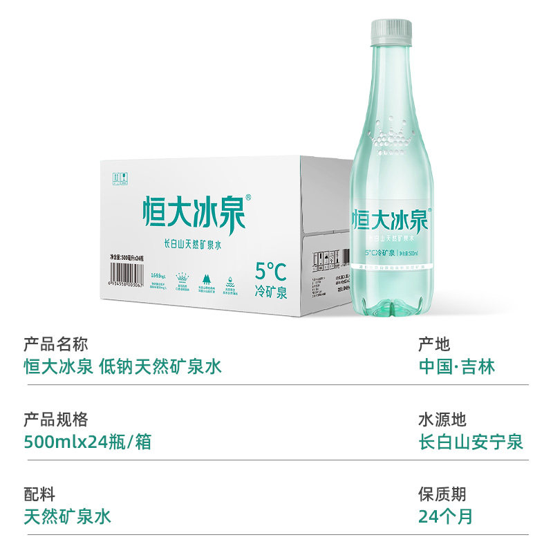 恒大冰泉长白山天然低钠矿泉水500ml*24瓶饮用水整箱装
