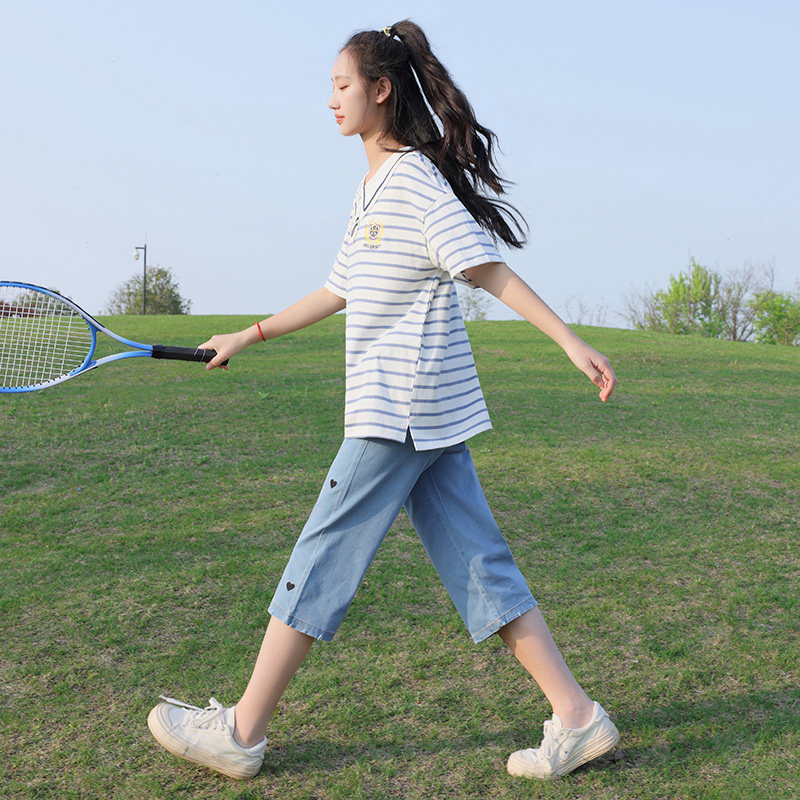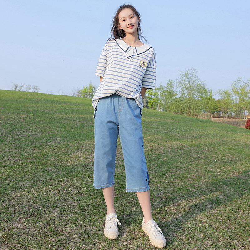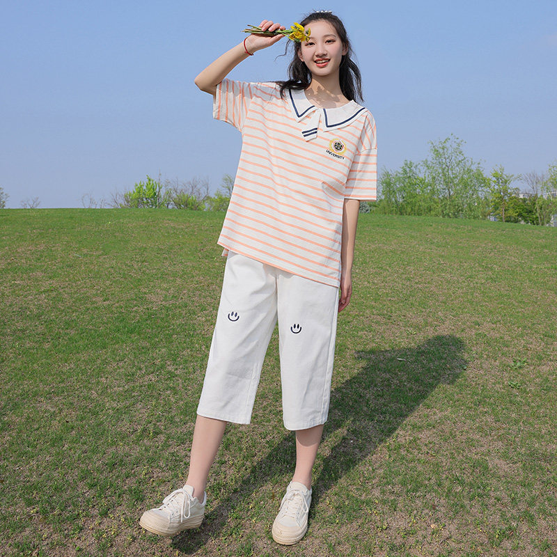 学生夏装女套装初中生学院风海军领新款高中生七分裤JK校服两件套
