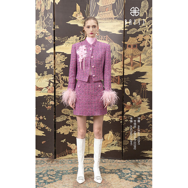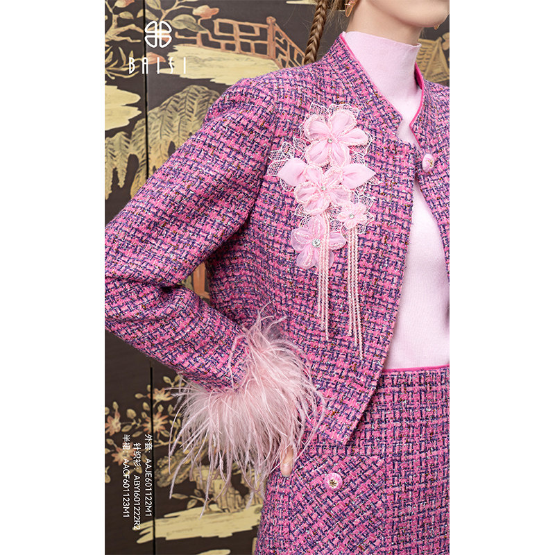 2026春季新品商场同款百丝气质上衣撞色粗花呢可拆袖短款外套女
