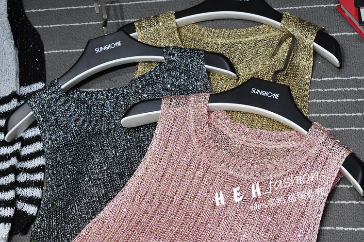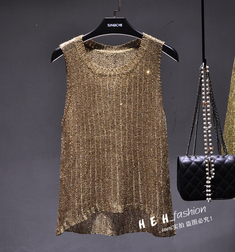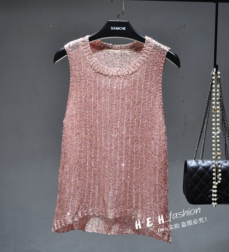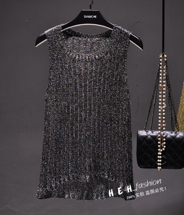 韩恩家 珠片亮丝圆领无袖简约百搭打底衫薄针织修身显瘦背心T恤女