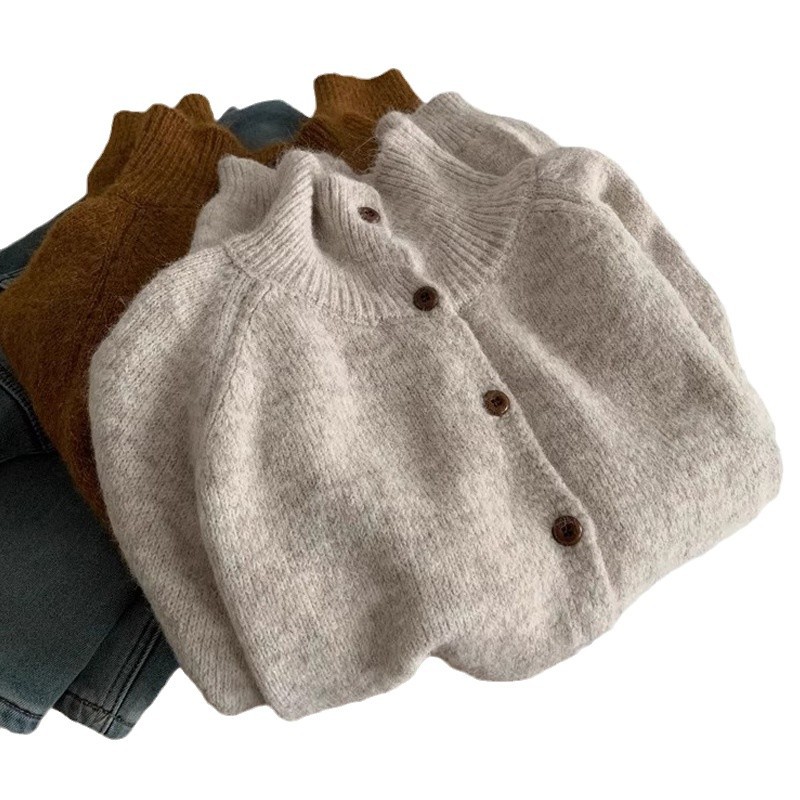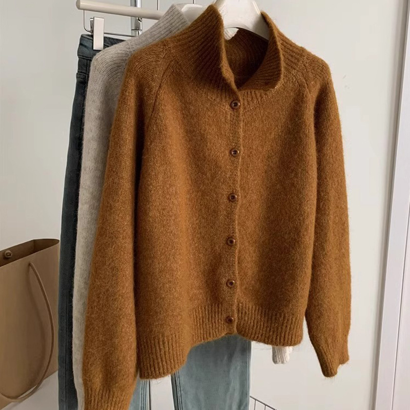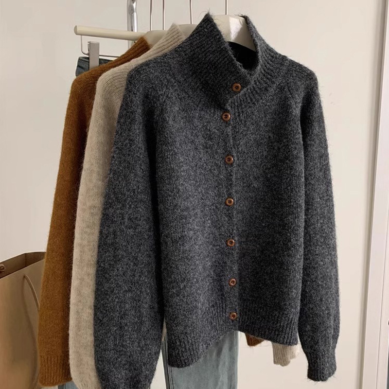 高级感立领针织开衫外套上衣女秋软糯慵懒灰色内搭高领扣子毛衣