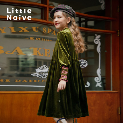 Little Naive礼服女童复古木耳边春秋冬丝绒连衣裙法式浪漫裙子