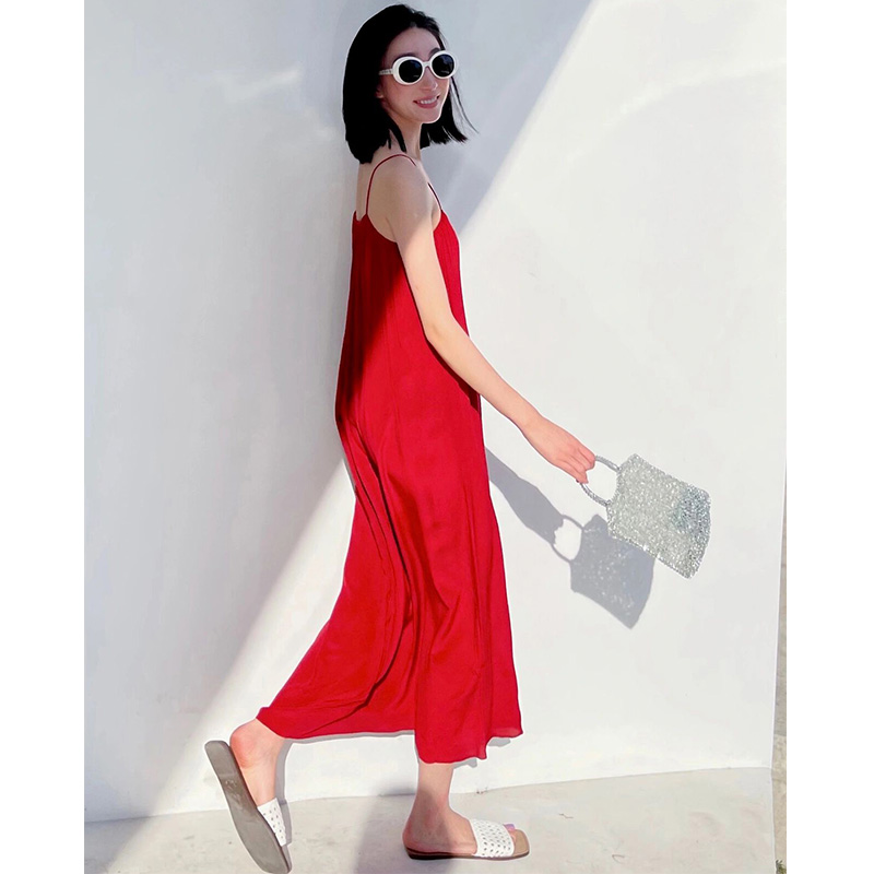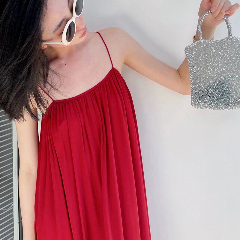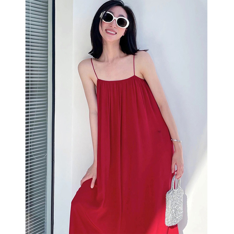 法式红色吊带连衣裙气质显瘦2025年新款夏季仙女长裙子设计感小众