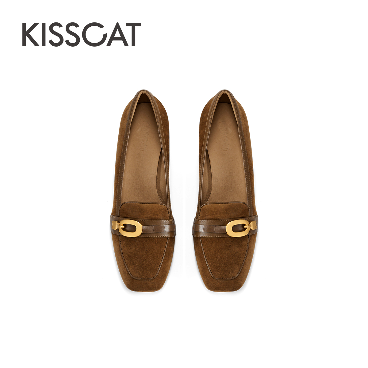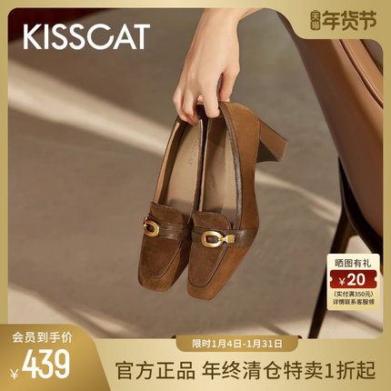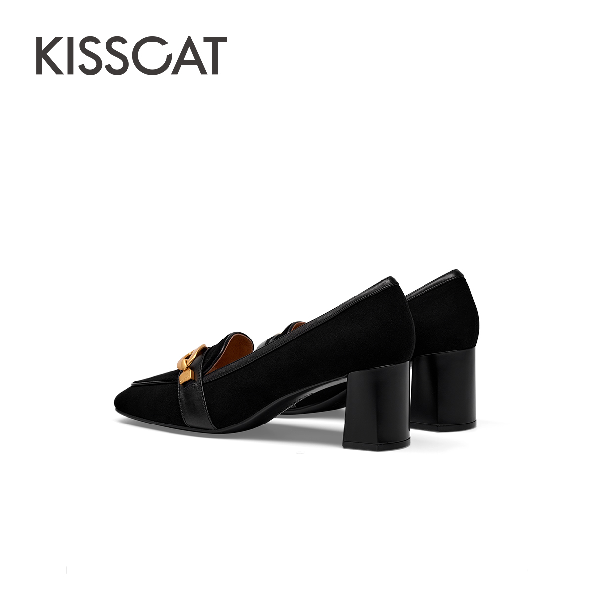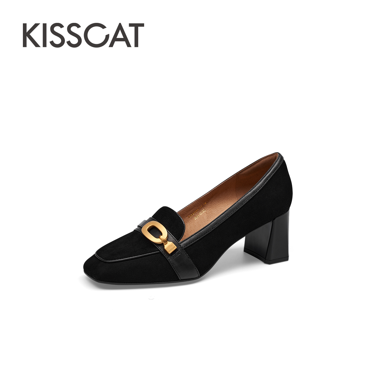 KISSCAT接吻猫秋季新款通勤乐福高跟鞋真皮复古深口单鞋女