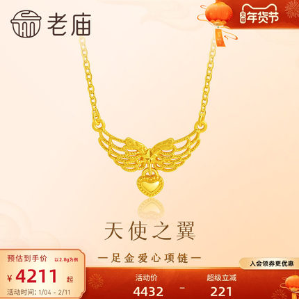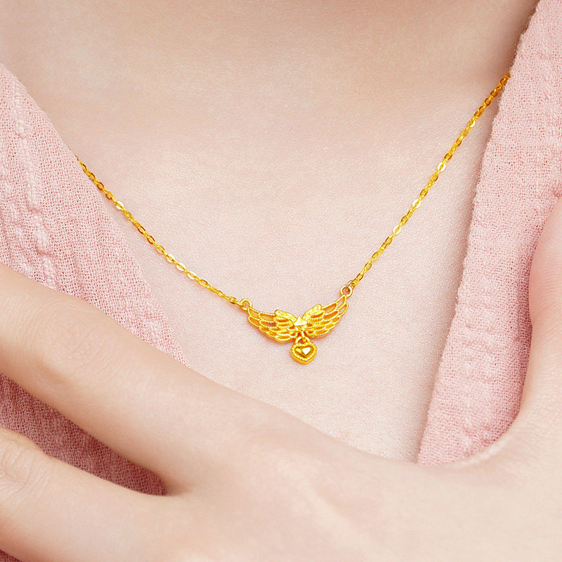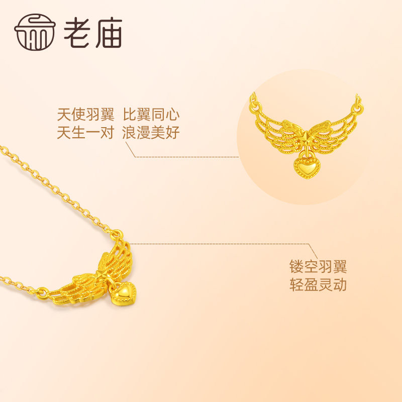 老庙黄金足金爱心项链5G天使之翼比翼同心守护浪漫美好百搭时尚