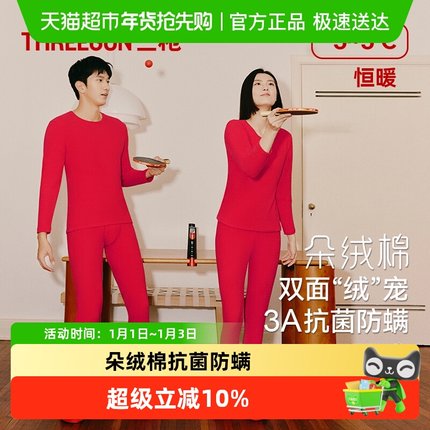 三枪朵绒棉保暖内衣男本命年大红纯棉秋衣秋裤女拉绒抗菌新婚新年