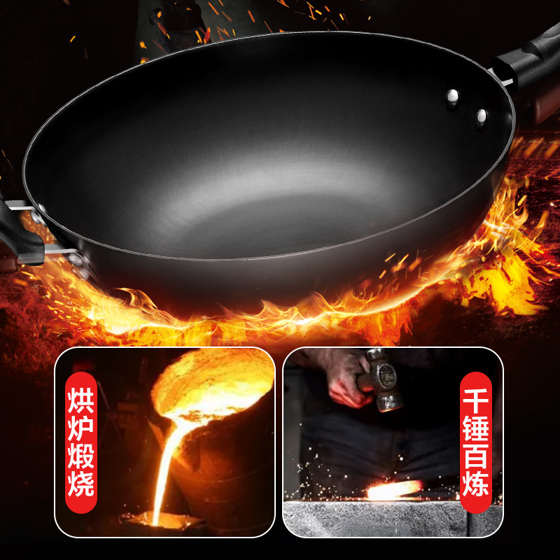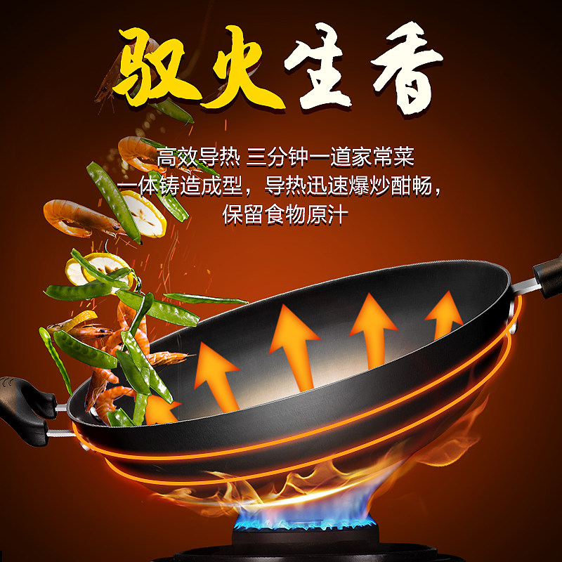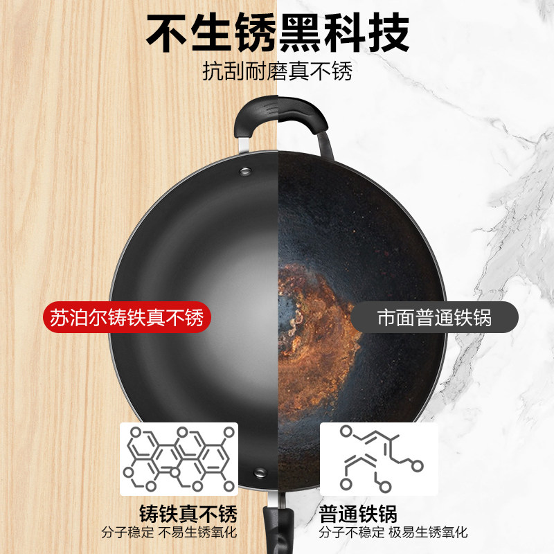 苏泊尔铸铁锅炒菜锅家用老式无涂层平底大炒锅煤气燃气灶适用