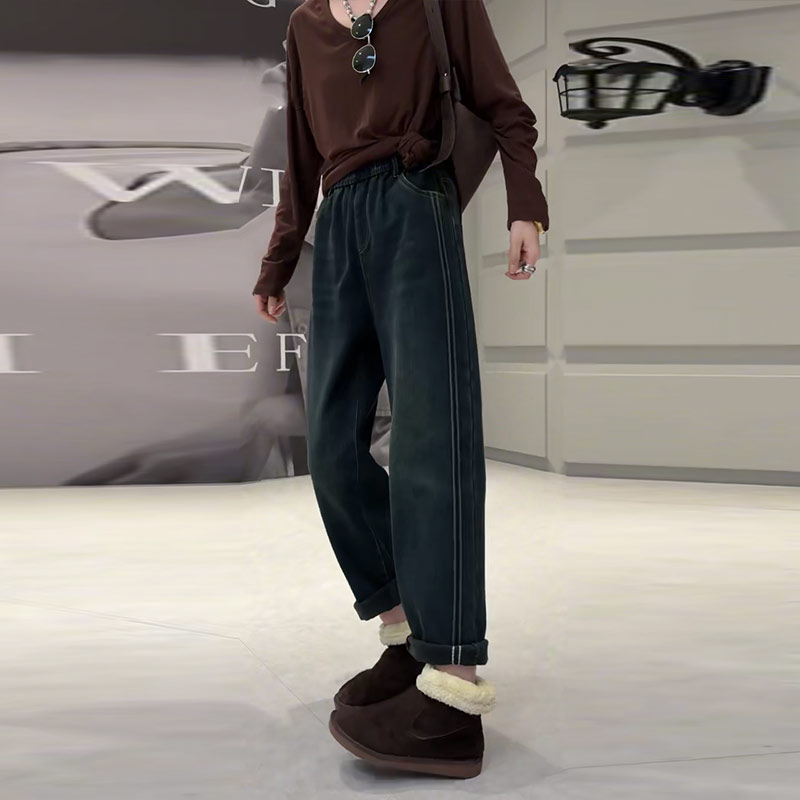 加肥胖妹妹松紧腰直筒牛仔裤子大码女装韩版冬季款百搭显瘦长裤潮