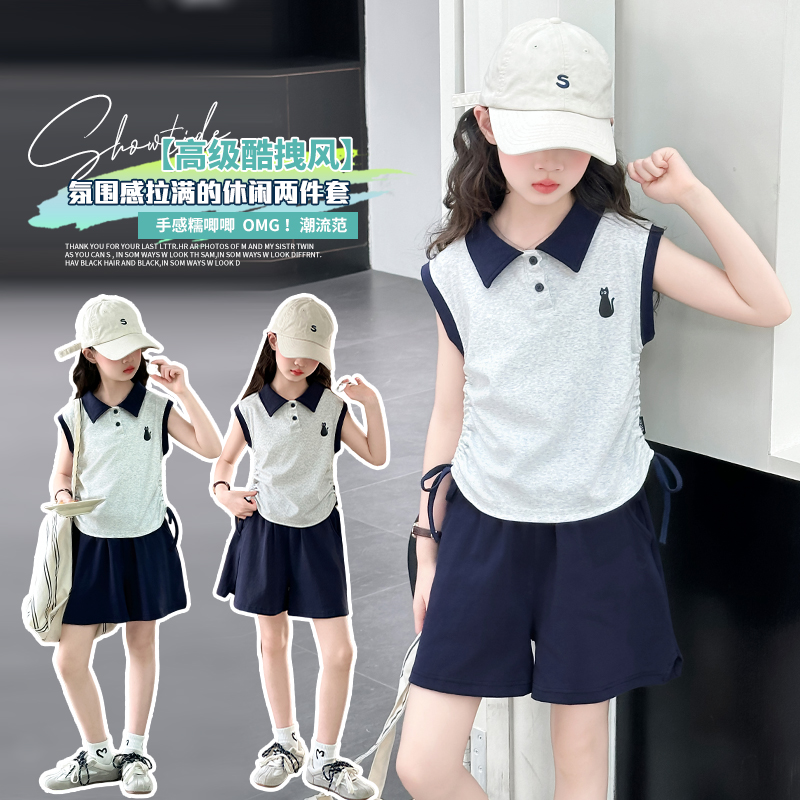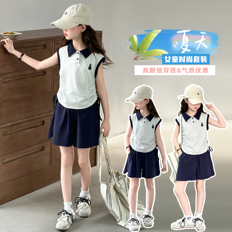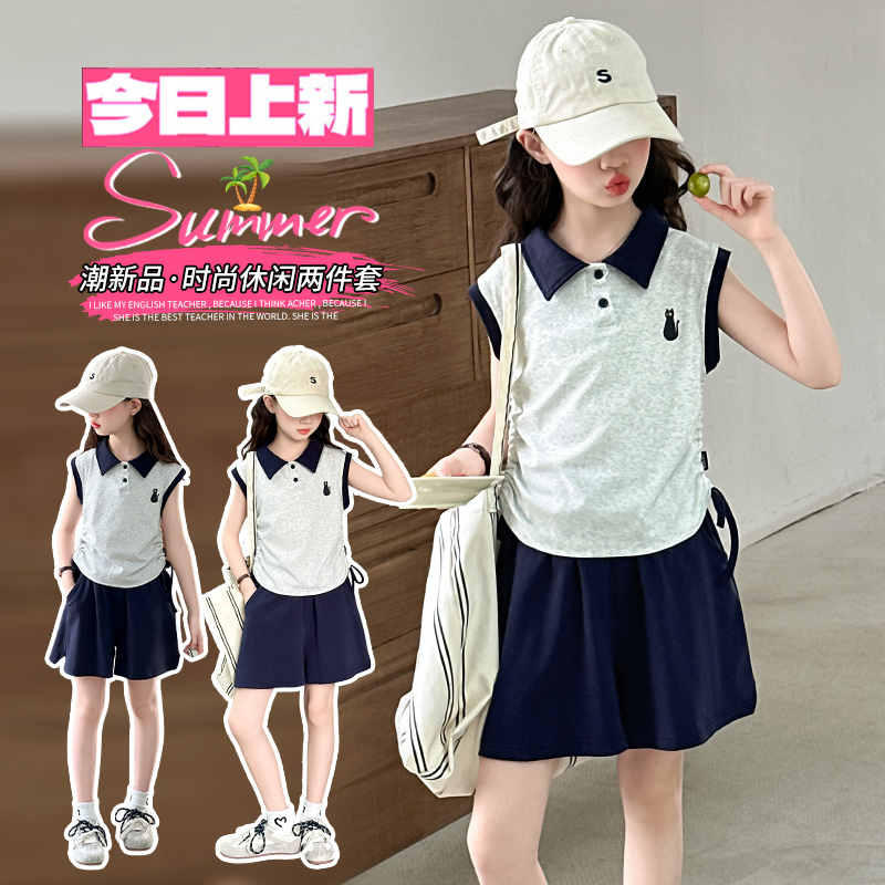 女童Polo衫套装夏季韩版女孩短袖短裤两件套大童纯棉休闲童装衣服