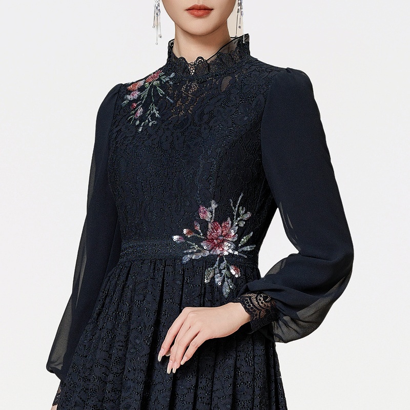 SUSSI/古色24冬季新品商场同款黑色宫廷风高级刺绣收腰连衣裙女装