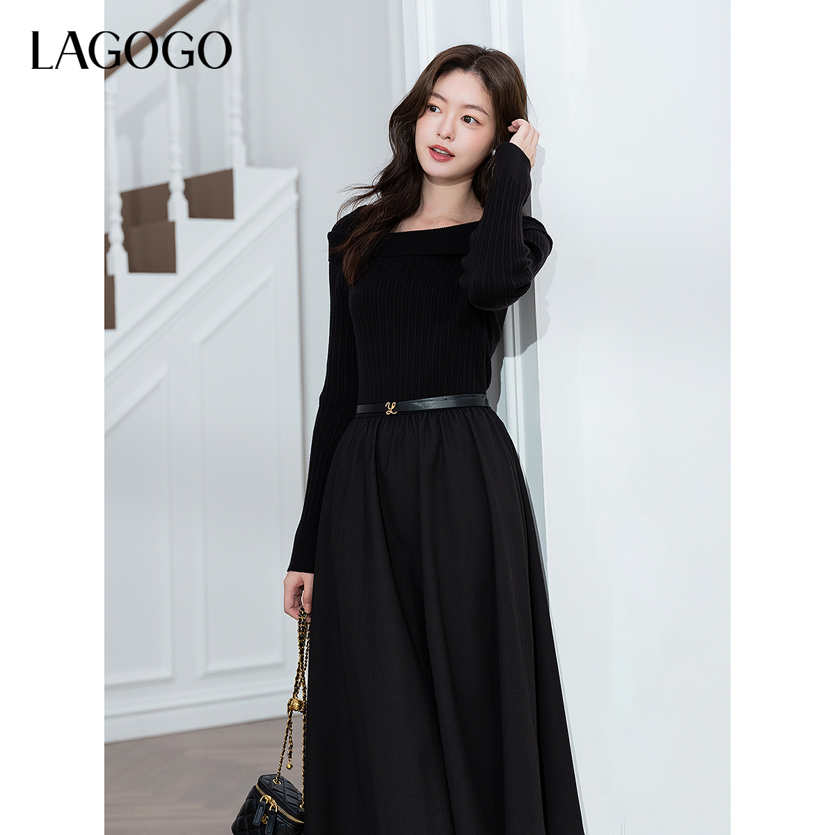 LAGOGO赫本风收腰显瘦小黑裙女拉谷谷2025秋冬新款长袖内搭连衣裙