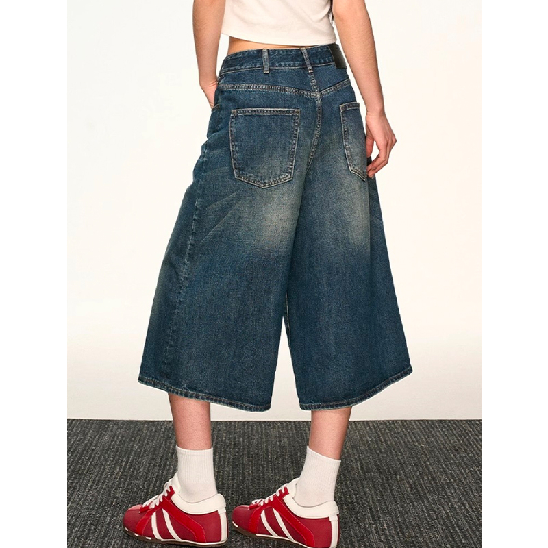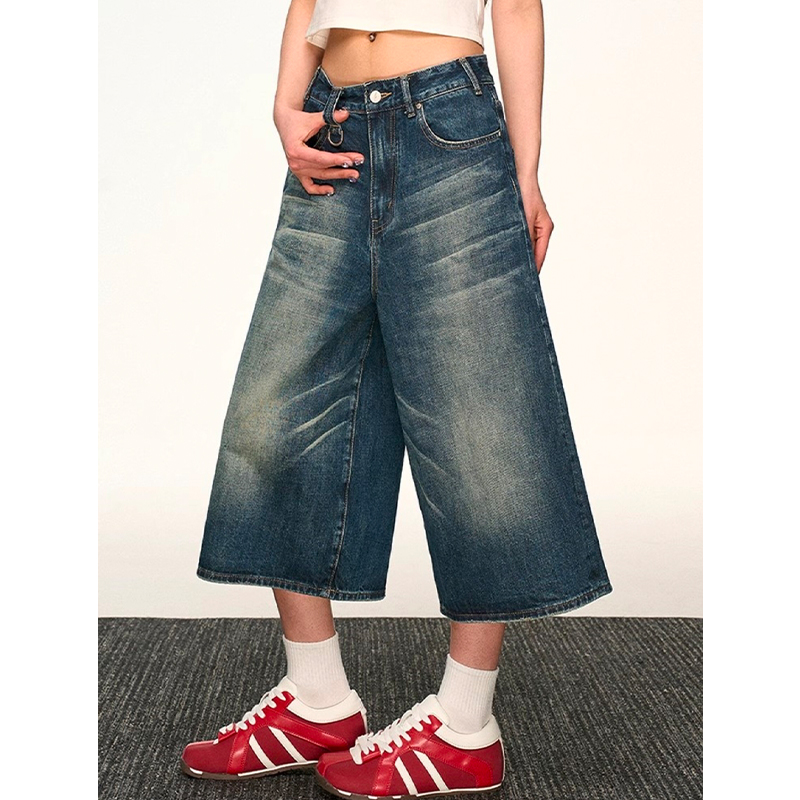 美式复古阔腿七分牛仔短裤女2025新款夏薄款高腰显瘦宽松a字中裤