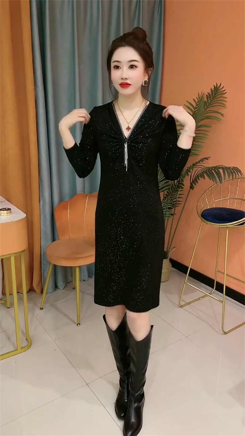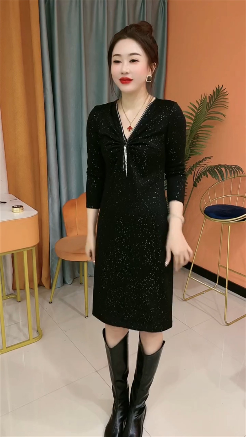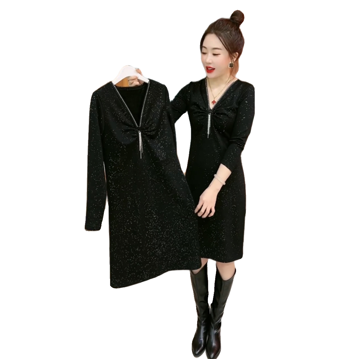 2023秋冬新款连衣裙女大码气质修身显瘦V领拉链满天星加绒打底裙