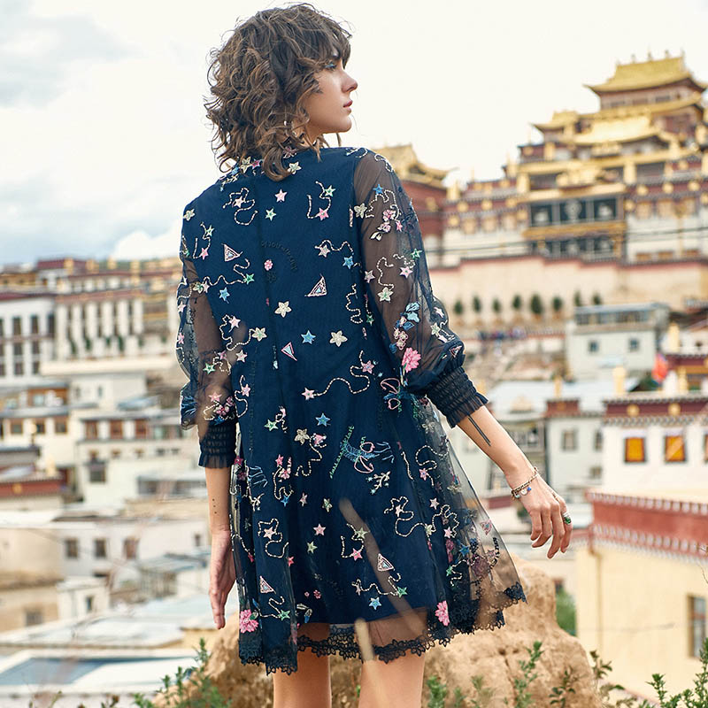 裂帛V领蕾丝拼接碎花边宽松舒适飘逸a字裙长袖连衣裙7119323002