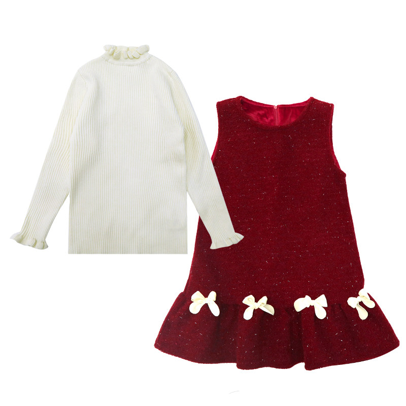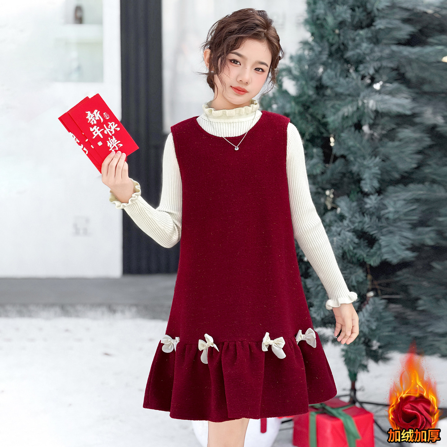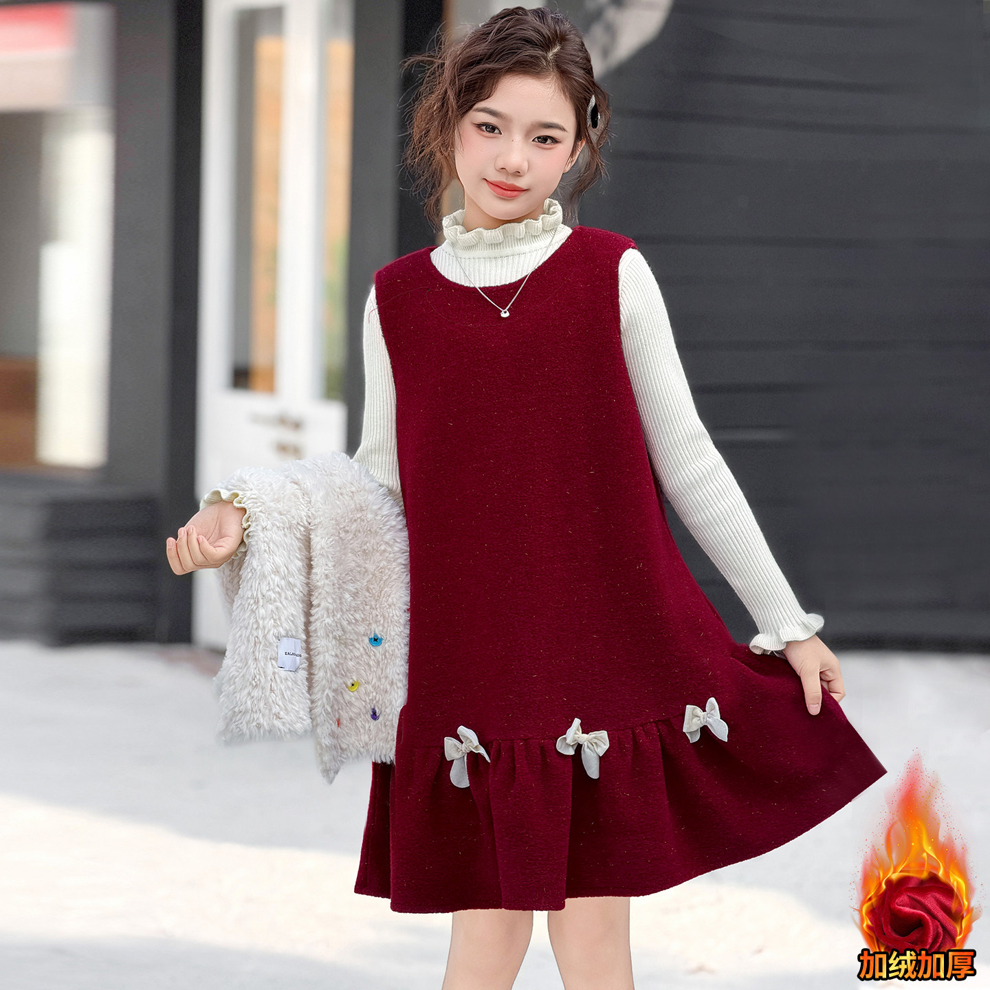 女童冬季加绒年服连衣裙套装2025新款女孩毛衣打底衫背心裙两件套