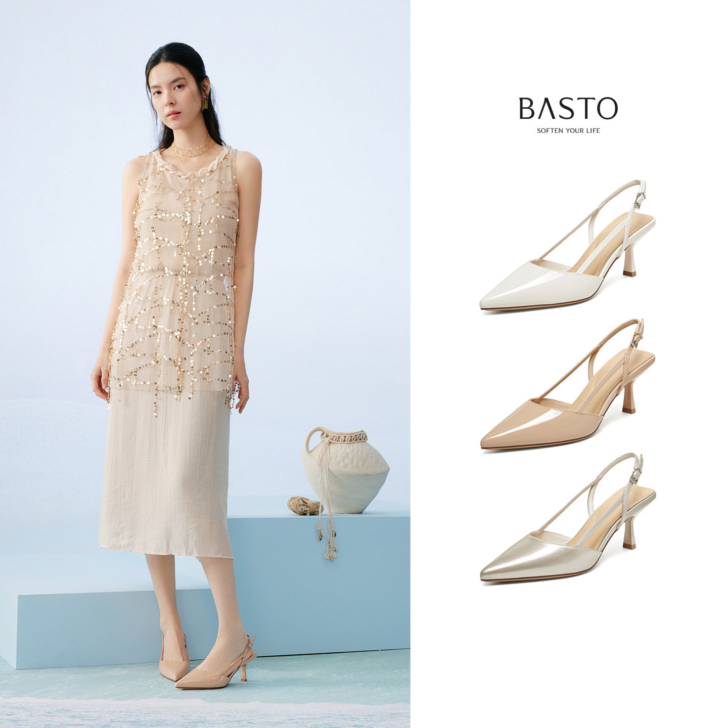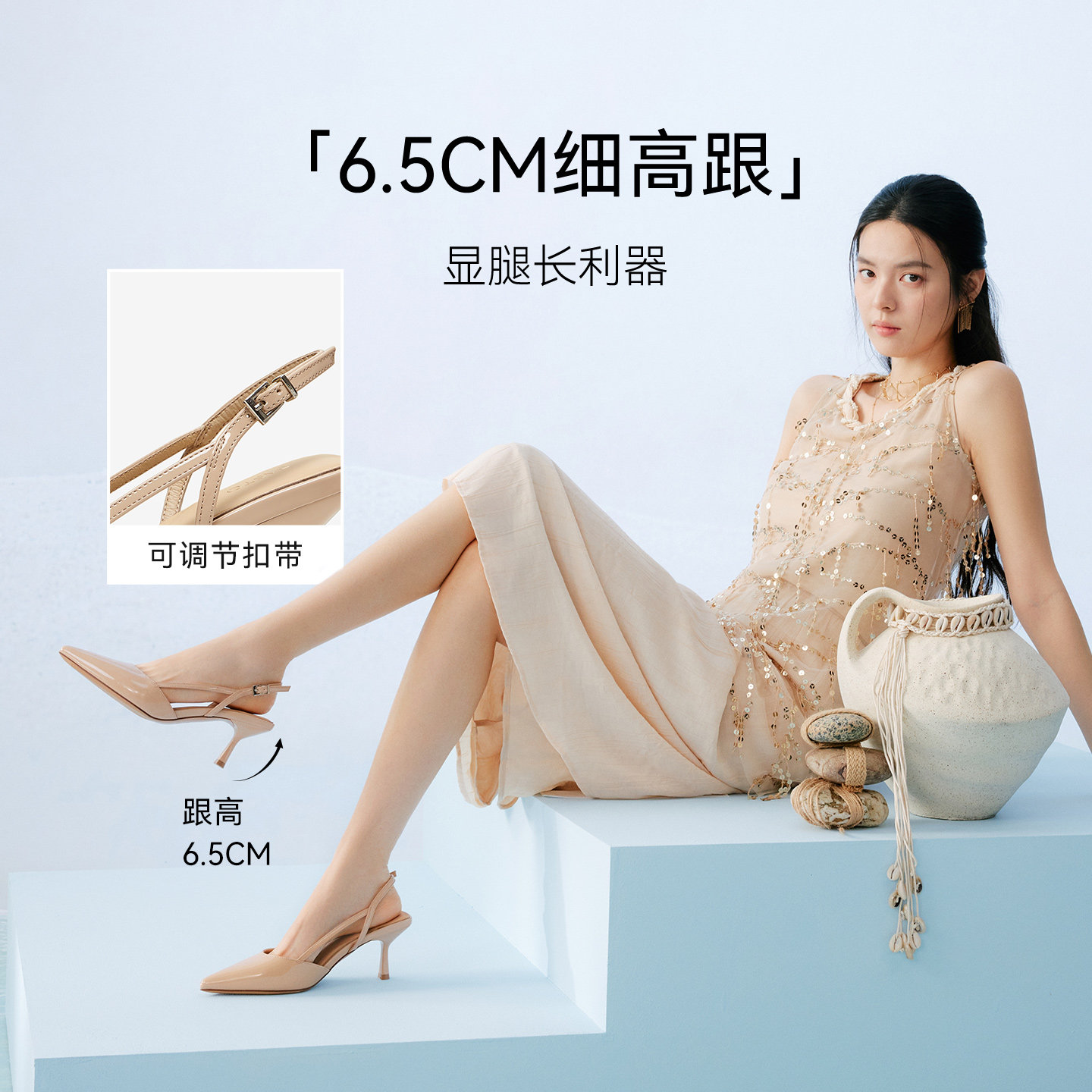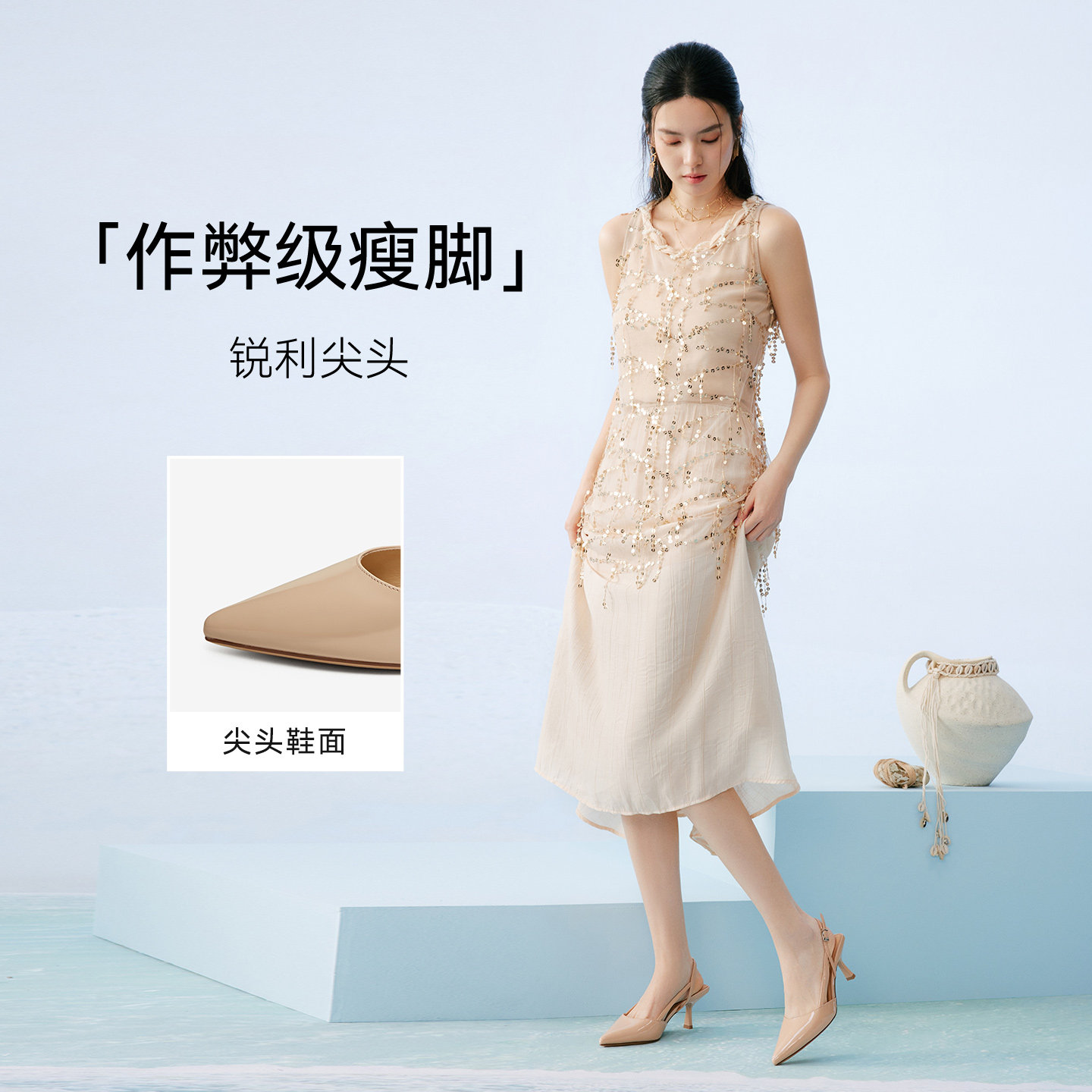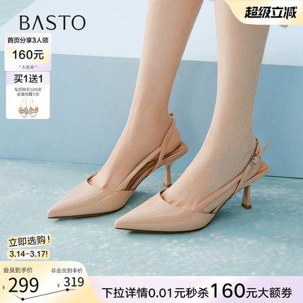 百思图夏季尖头后空细高跟凉鞋