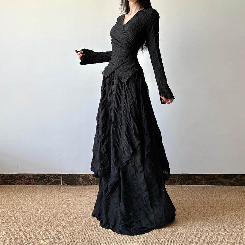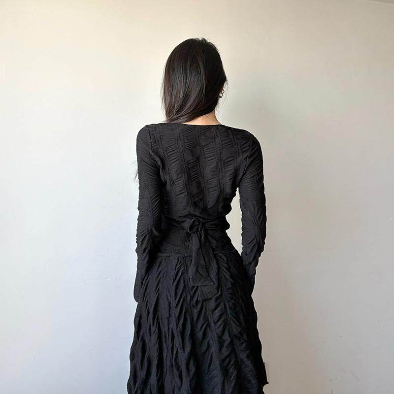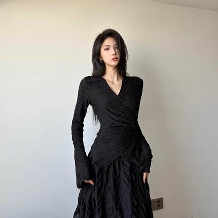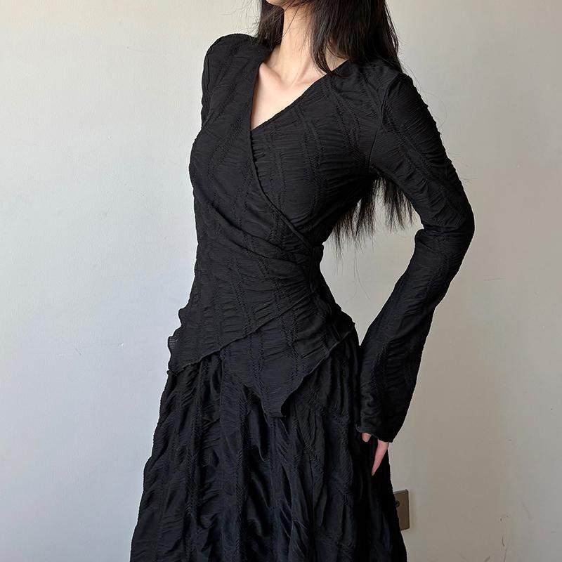 gagaopt纯色不规则设计感长袖V领T恤女春季新款绑带收腰修身上衣