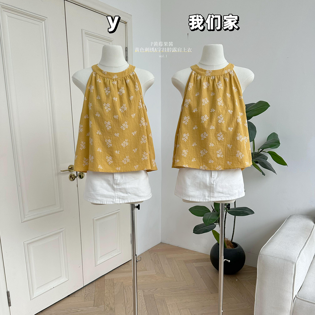 柒月末 黄莓果酱 黄色刺绣上衣女夏季A字宽松挂脖小衫无露肩上衣