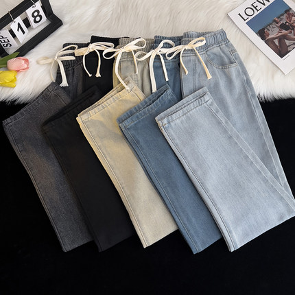 高街水洗抽绳松紧腰牛仔裤男女修身夏季薄款直筒宽松阔腿休闲长裤