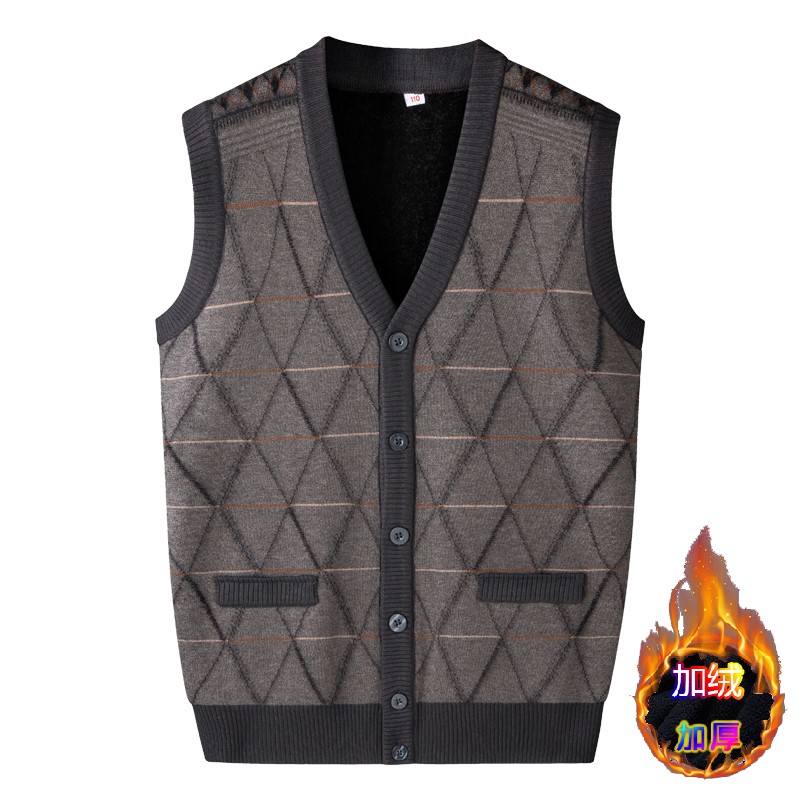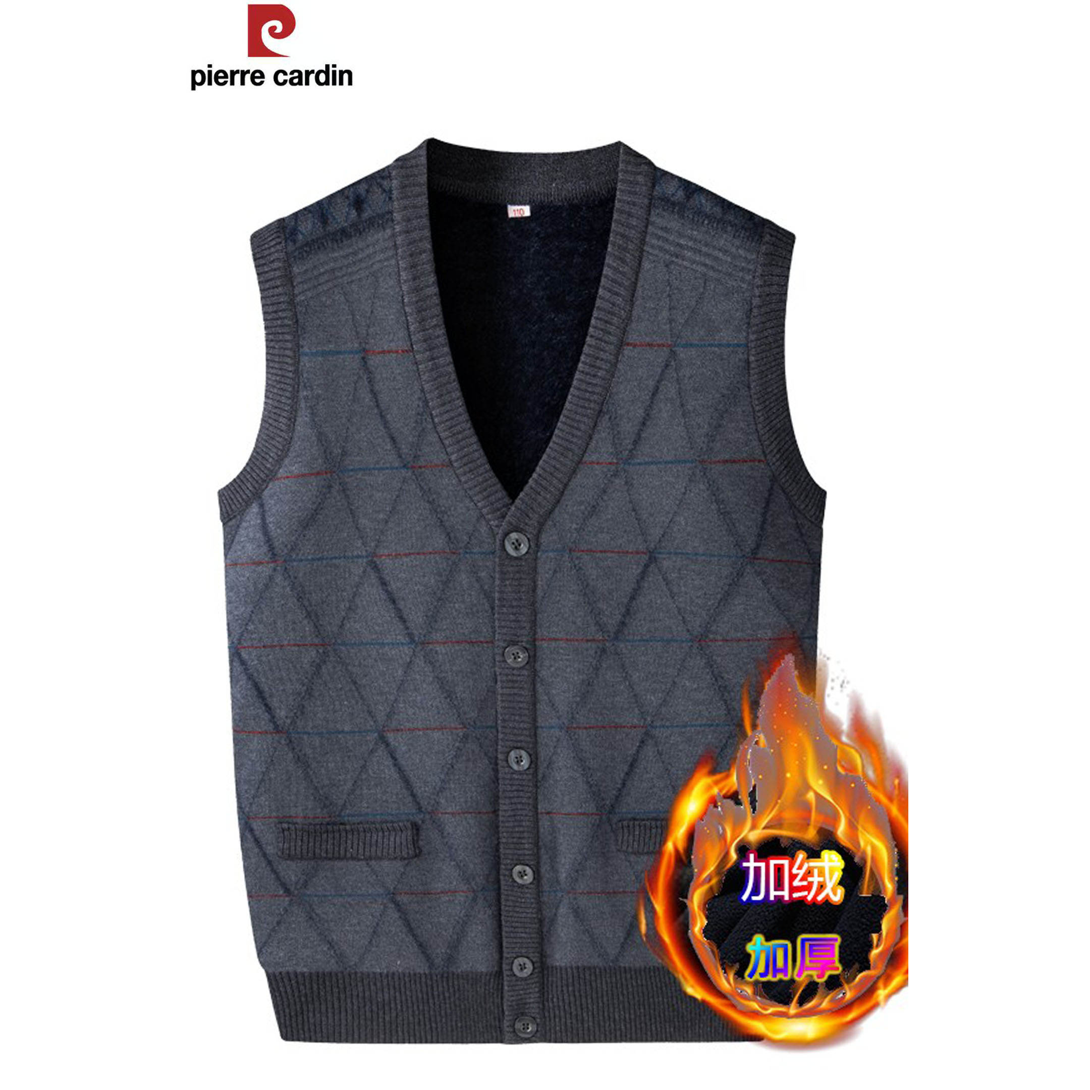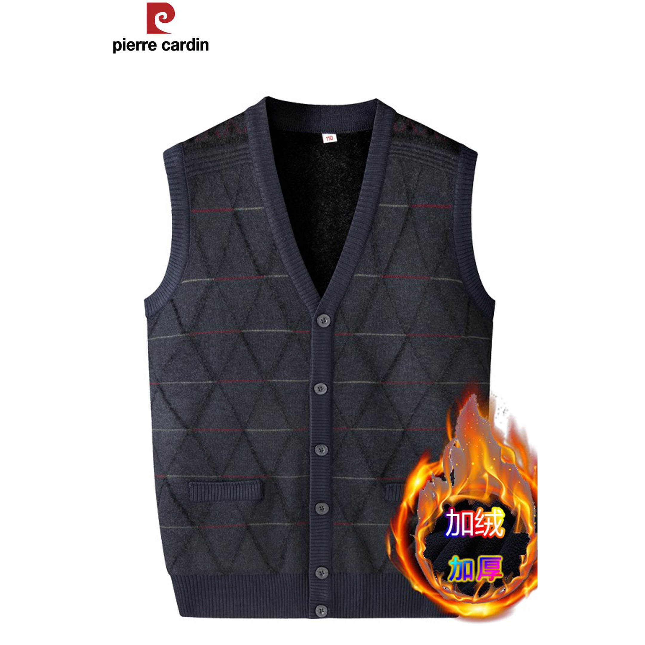 皮尔卡丹秋冬中老年人加绒针织马甲开衫男士爸爸加绒V领毛衣外套