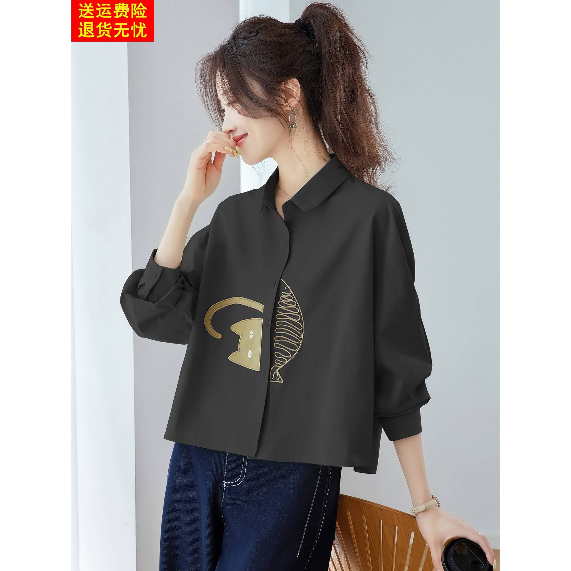 纯棉女士衬衫2025新款早秋时尚宽松百搭休闲翻领长袖衬衣刺绣上衣