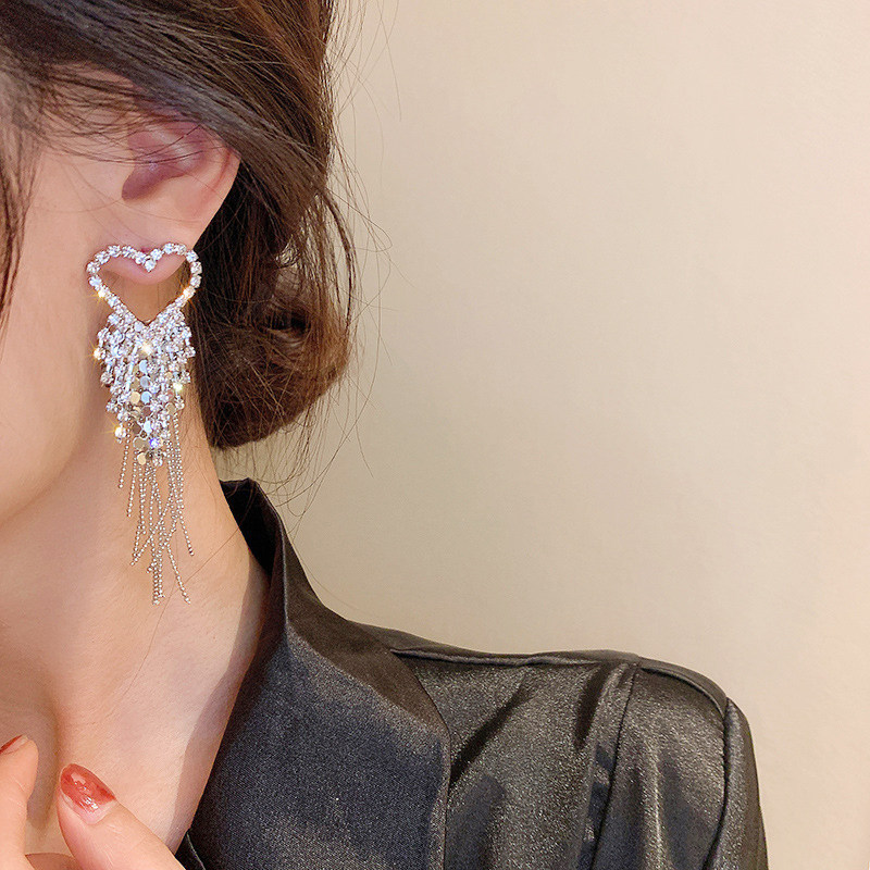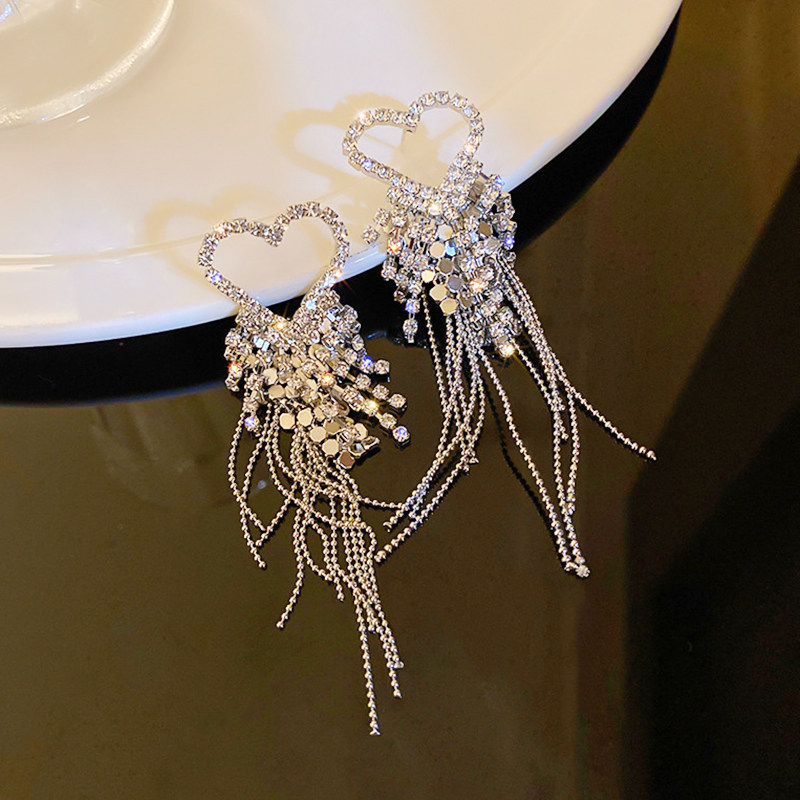 银针欧美镶钻米珠爱心银色流苏耳环女气质满钻长款耳坠夸张耳饰品