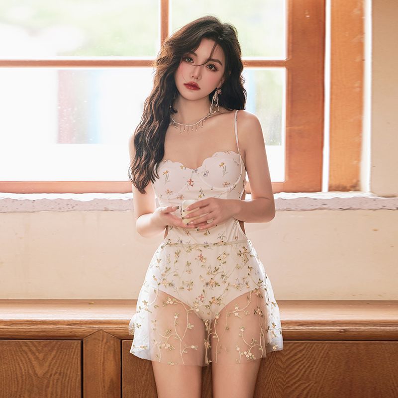 韩国新款性感碎花连体裙式遮肚显瘦小胸聚拢度假泡温泉游泳衣女