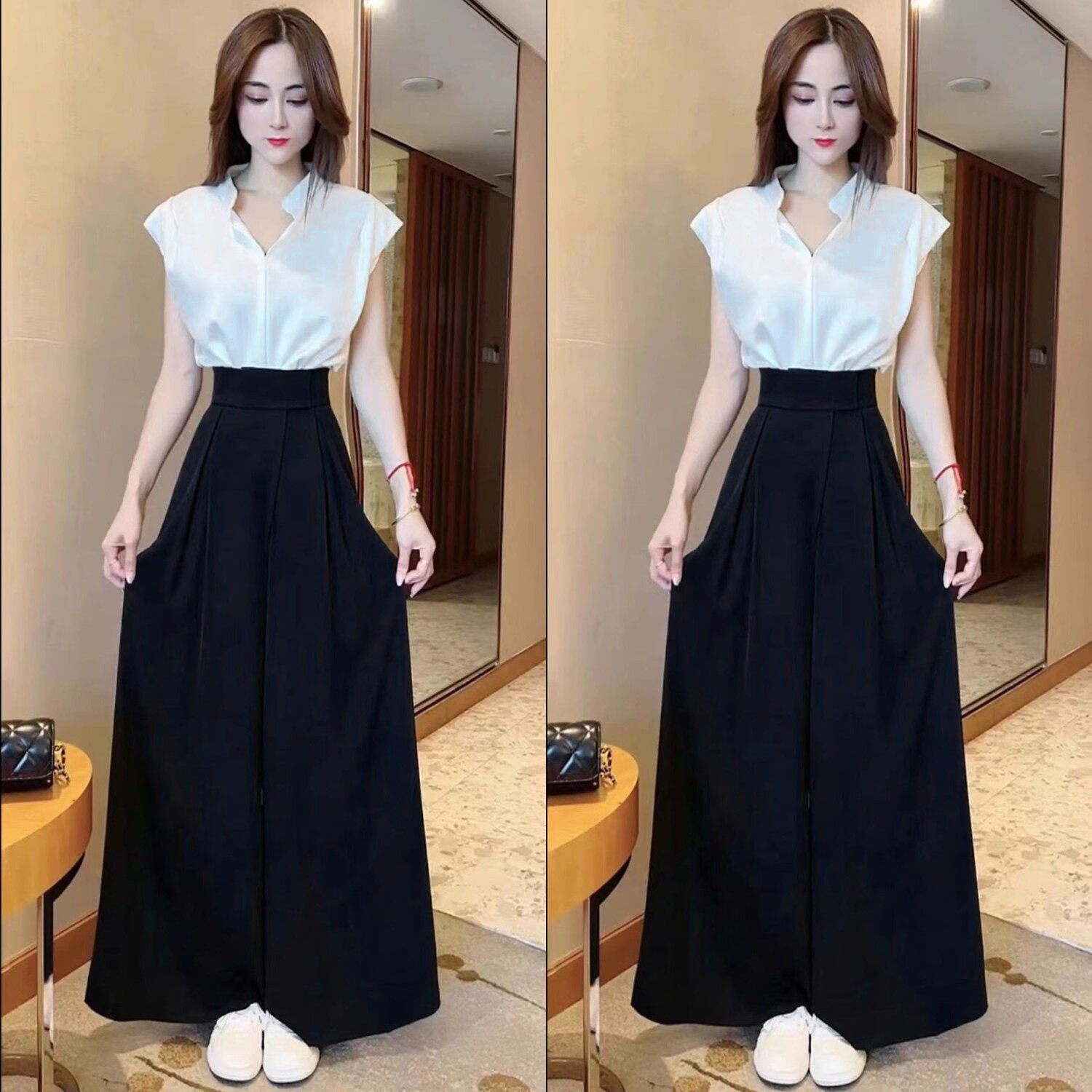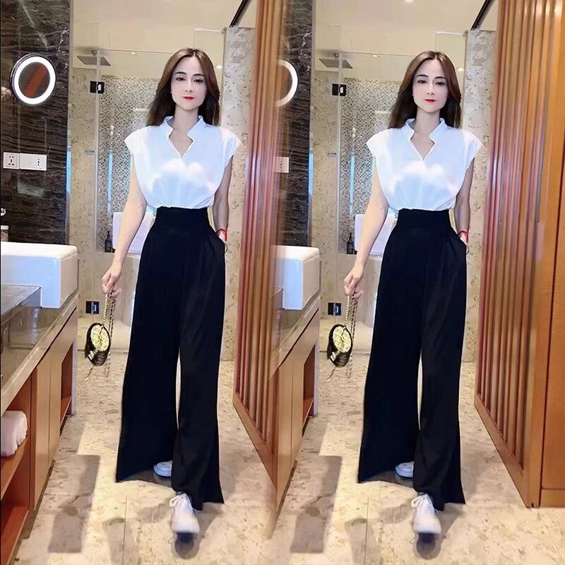 2026夏季新款时尚气质显瘦套装女立领飞飞袖上衣阔腿裤长裤两件套