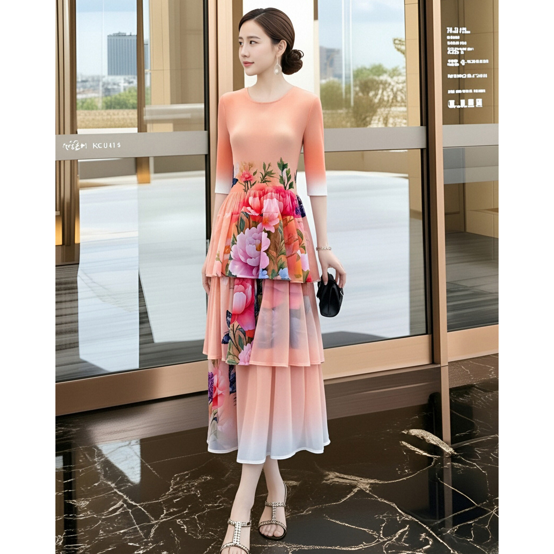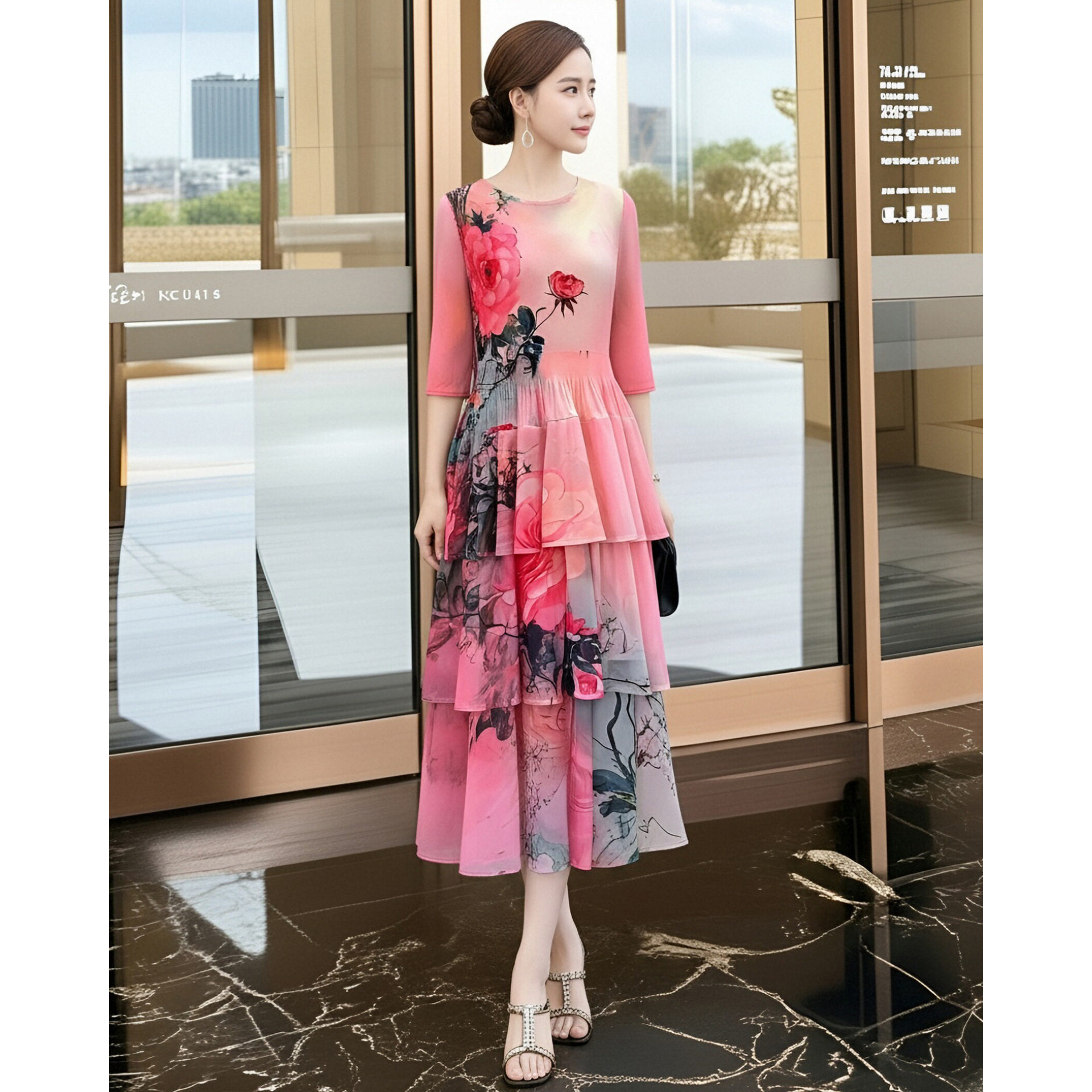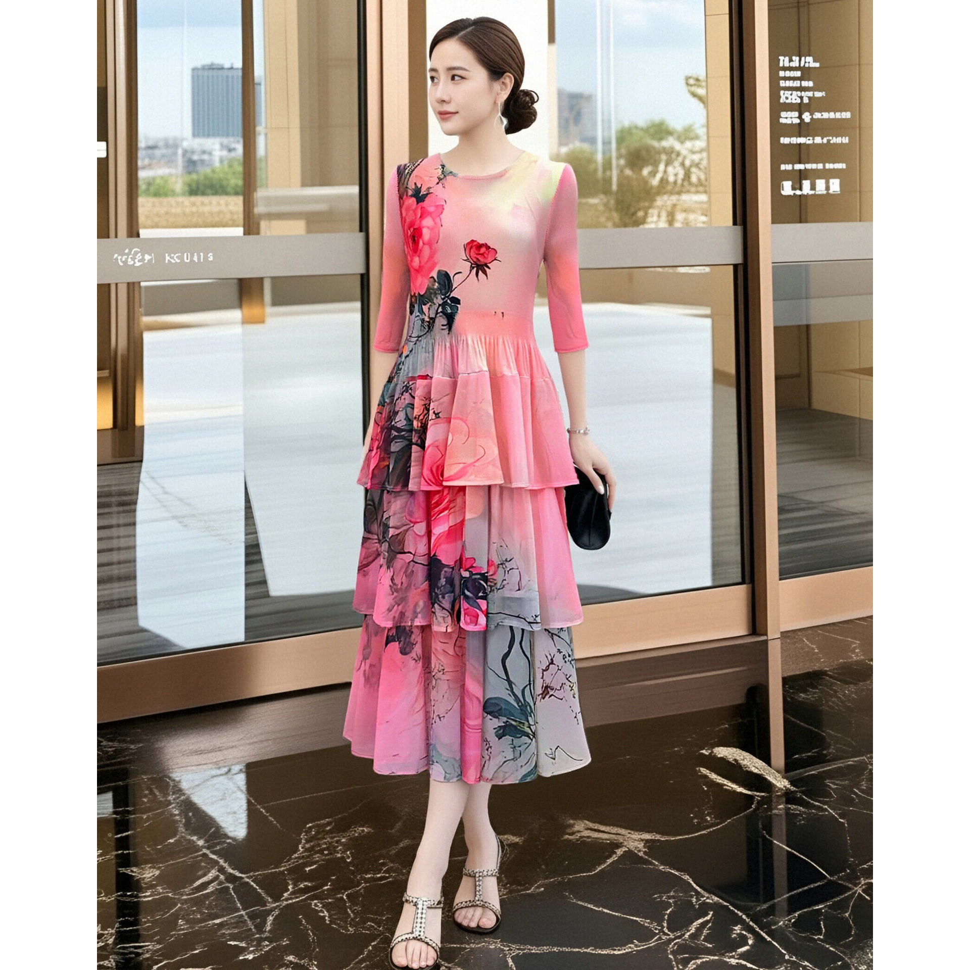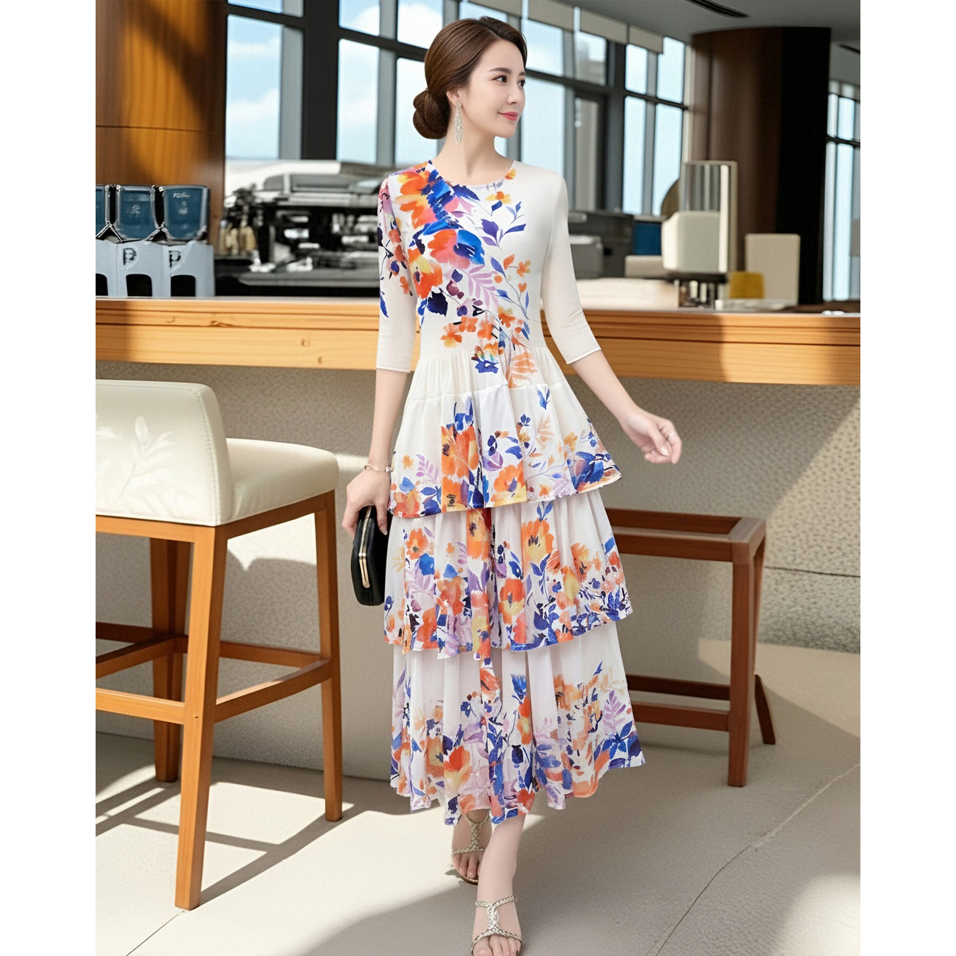 高品质感优雅气质连衣裙春装2026新款收腰褶皱蛋糕裙礼服中长裙