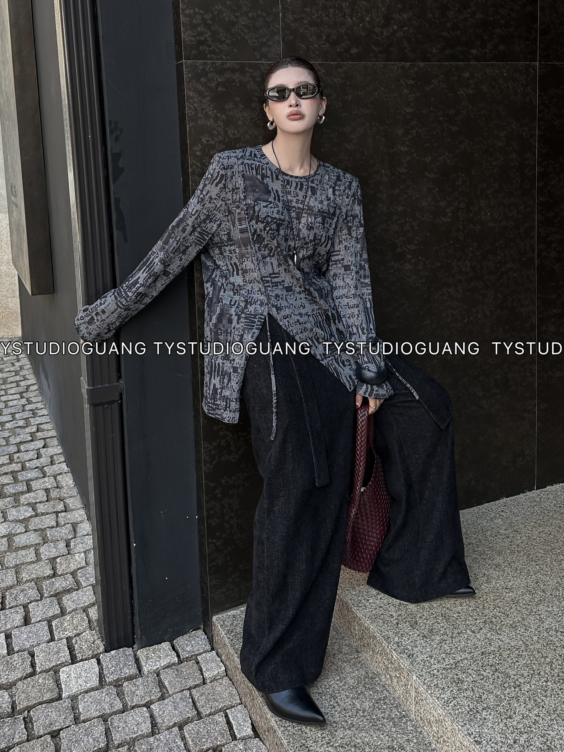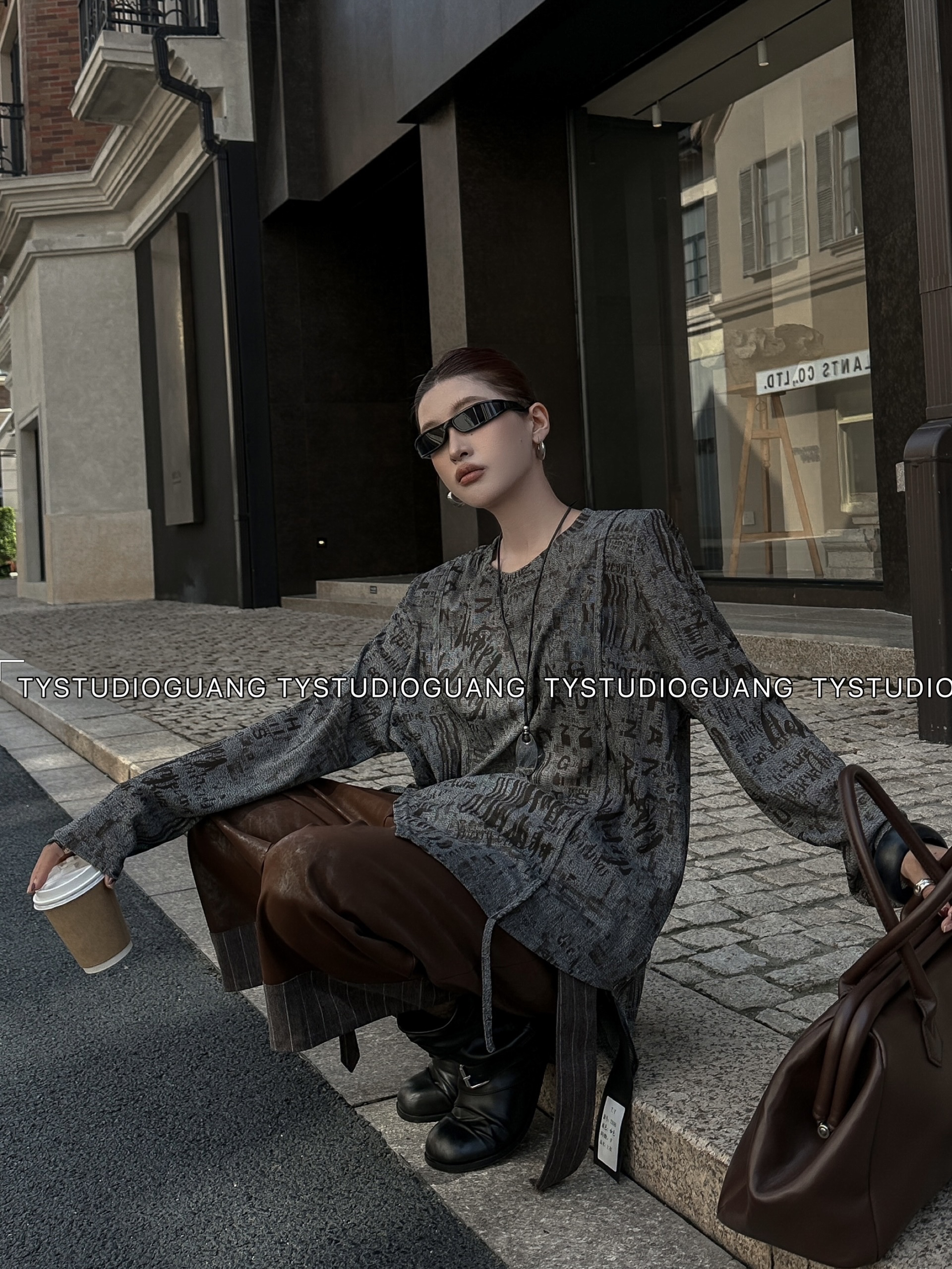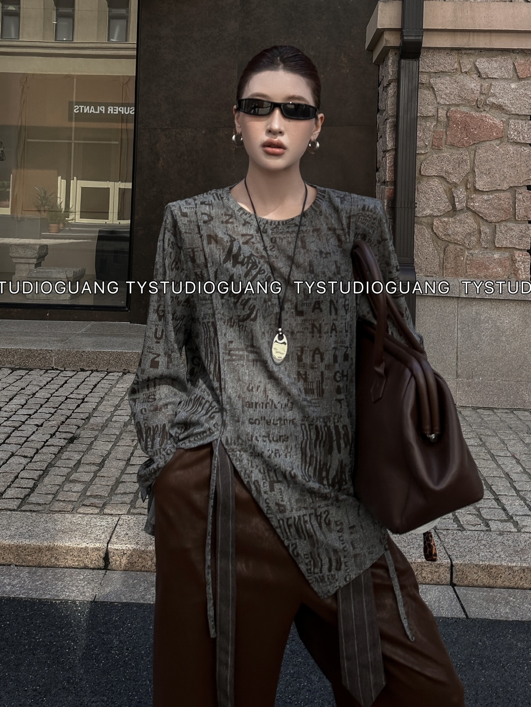 长袖T恤女2025秋季新款慵懒风宽松洋气不规则设计感小众印花上衣