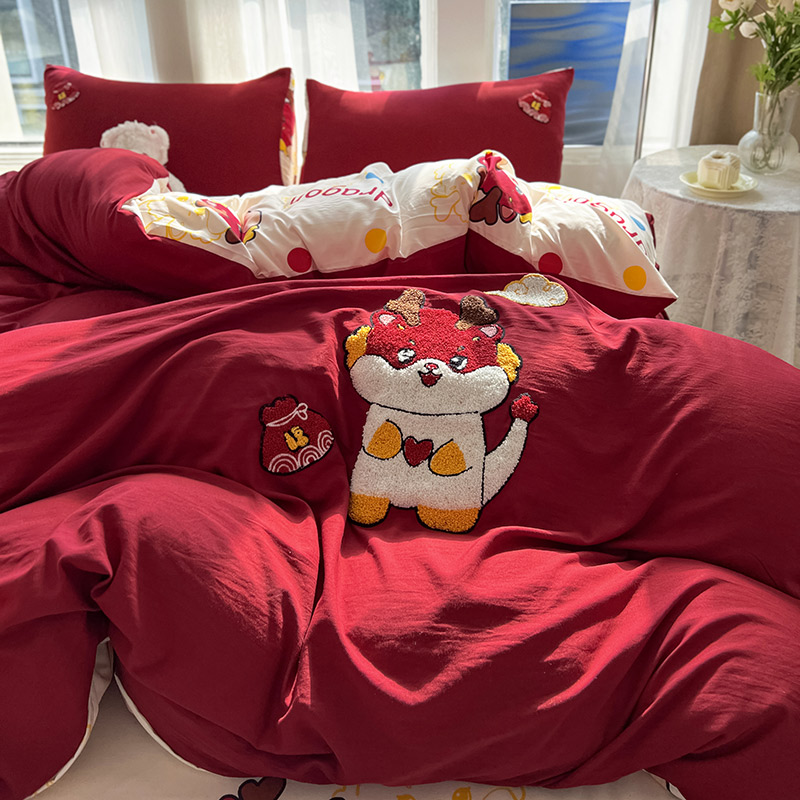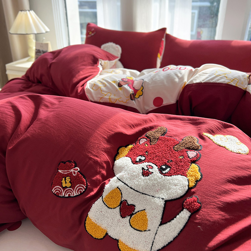 龙年卡通毛巾绣水洗棉四件套红色床上用品学生可爱印花床单三件套